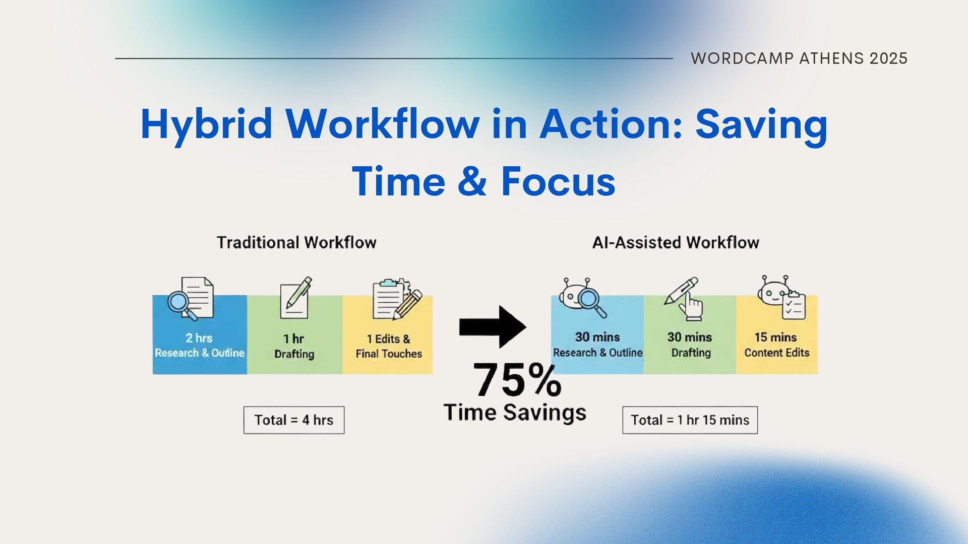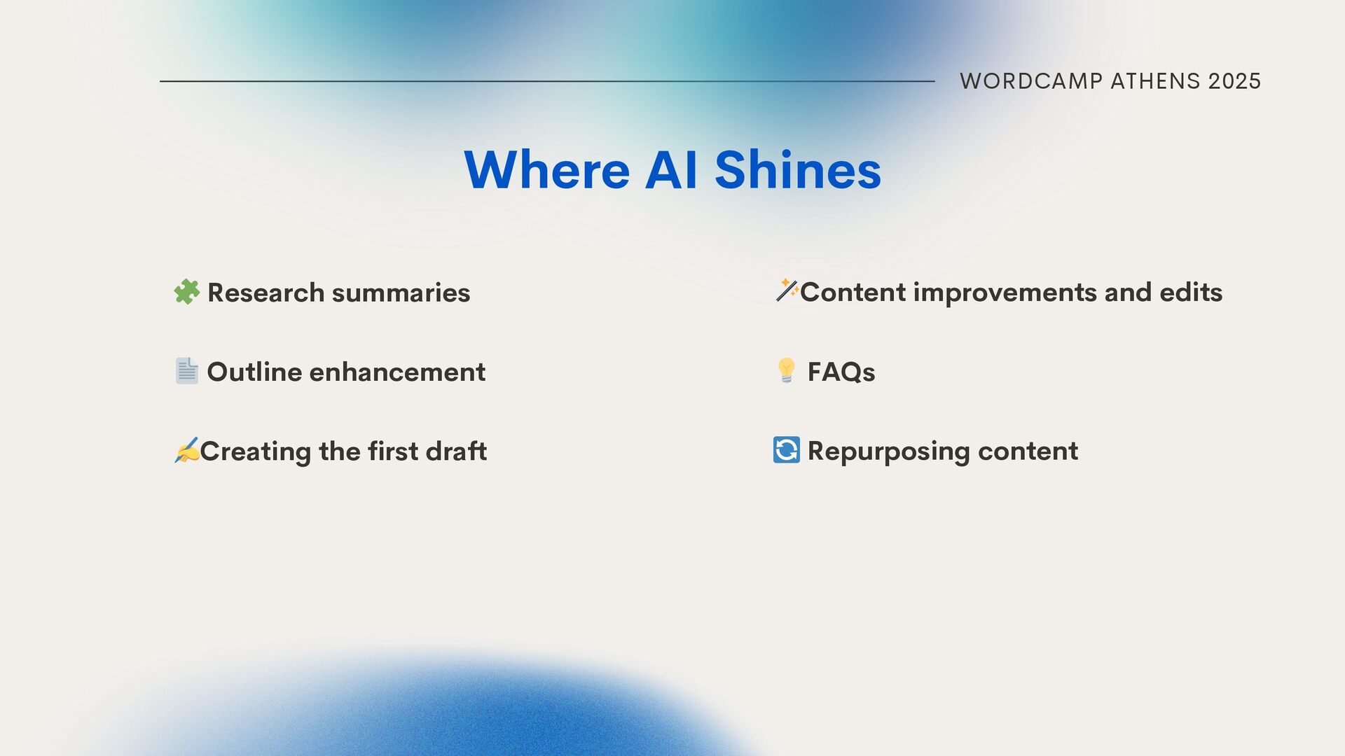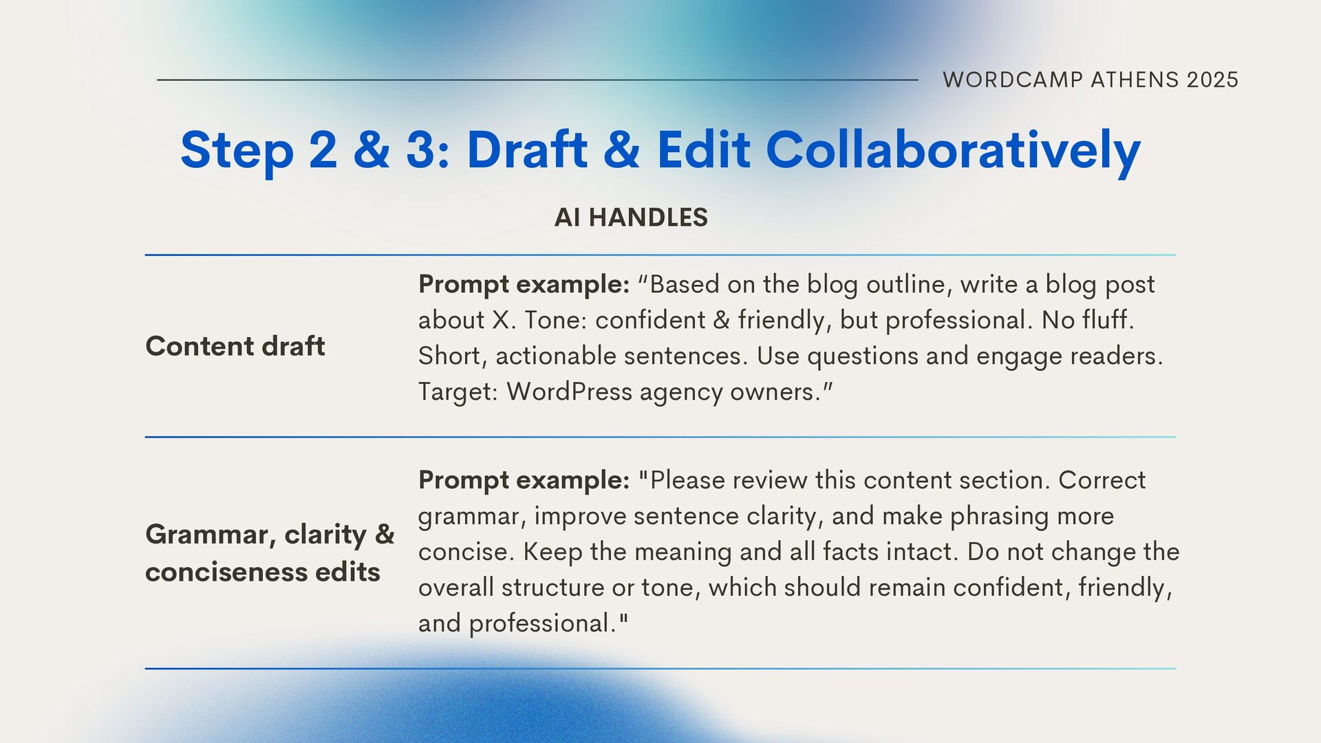 Collaboratively Content draft Grammar, clarity & conciseness edits Prompt example: “Based on the blog outline, write a blog post about X. Tone: confident & friendly, but professional. No fluff. Short, actionable sentences. Use questions and engage readers. Target: WordPress agency owners.” AI HANDLES Prompt example: "Please review this content section. Correct grammar, improve sentence clarity, and make phrasing more concise. Keep the meaning and all facts intact. Do not change the overall structure or tone, which should remain confident, friendly, and professional."
