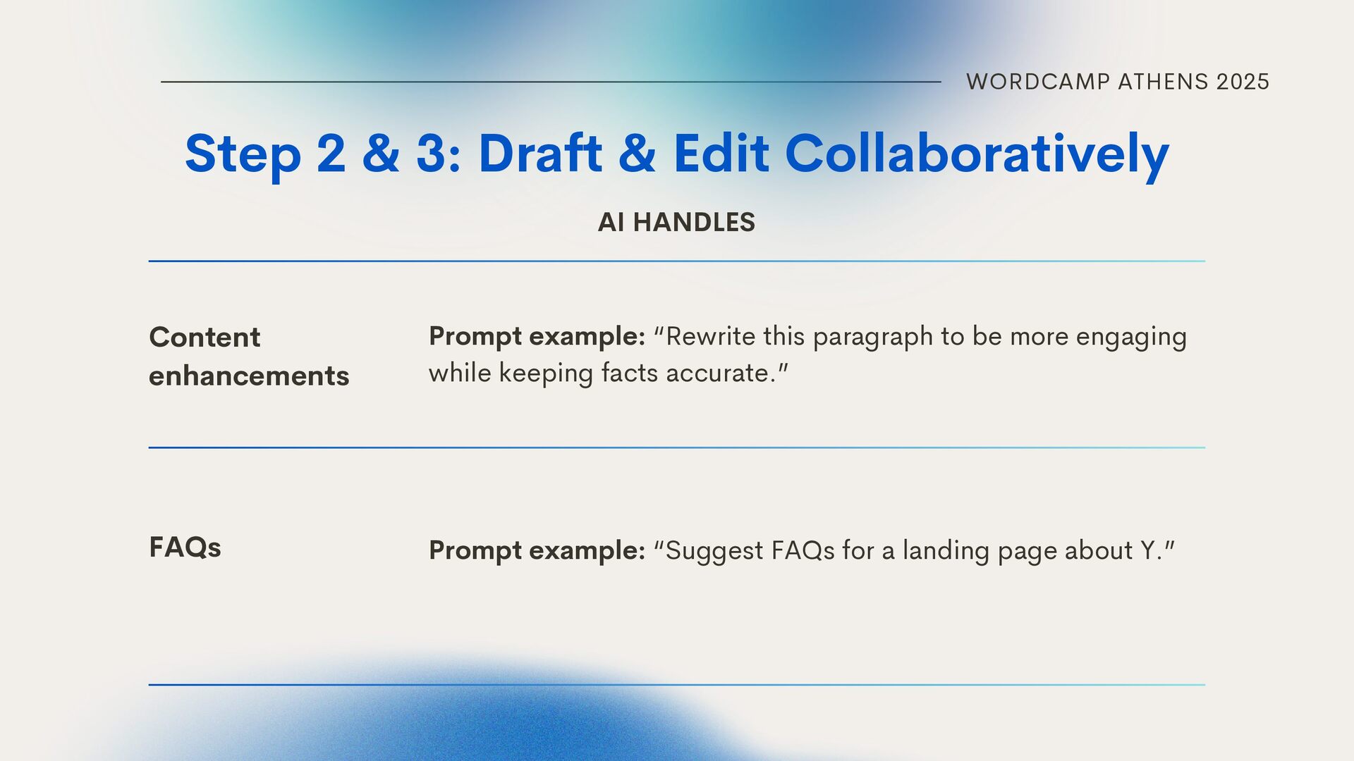 Collaboratively Content enhancements FAQs Prompt example: “Rewrite this paragraph to be more engaging while keeping facts accurate.” AI HANDLES Prompt example: “Suggest FAQs for a landing page about Y.”