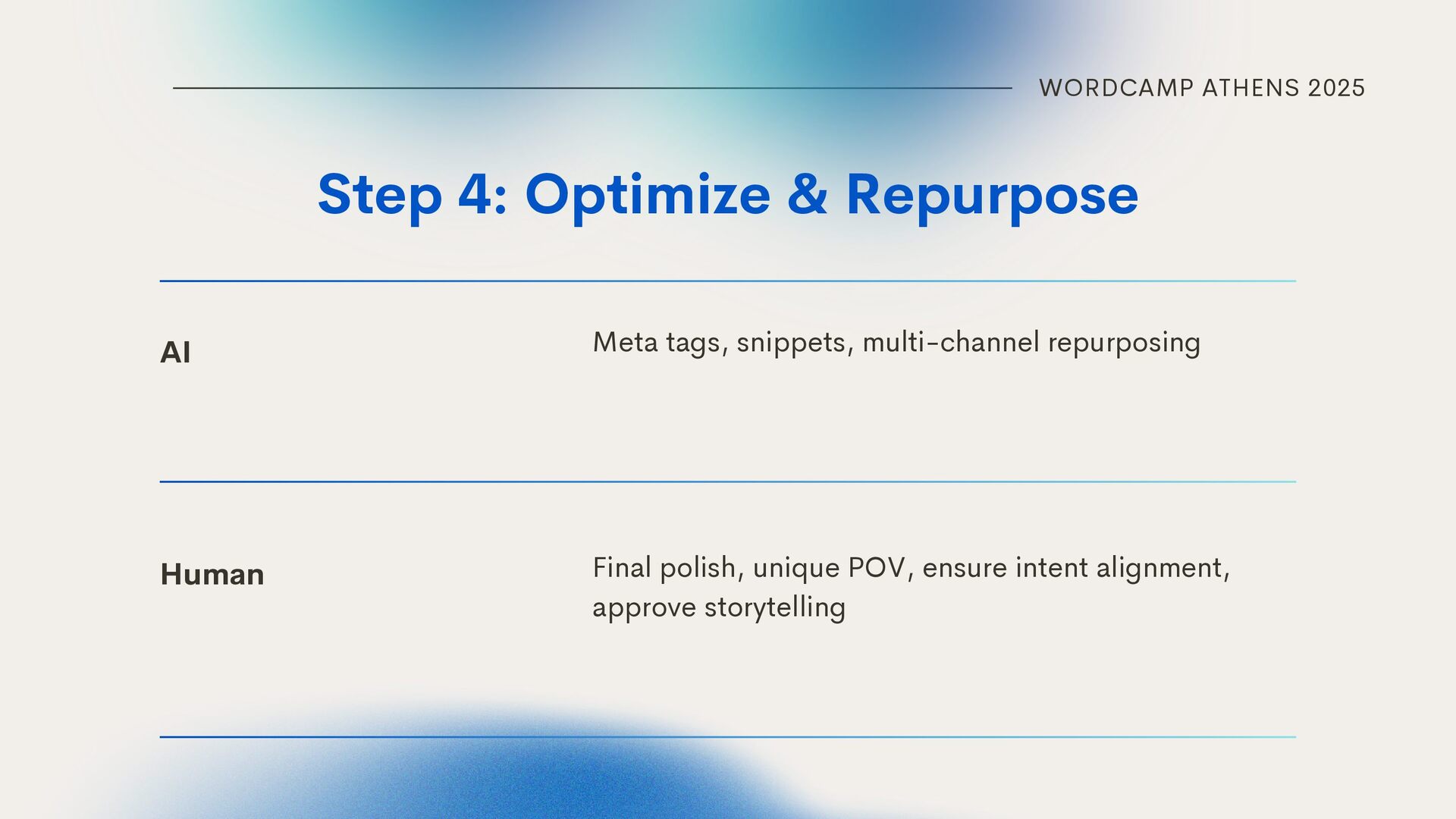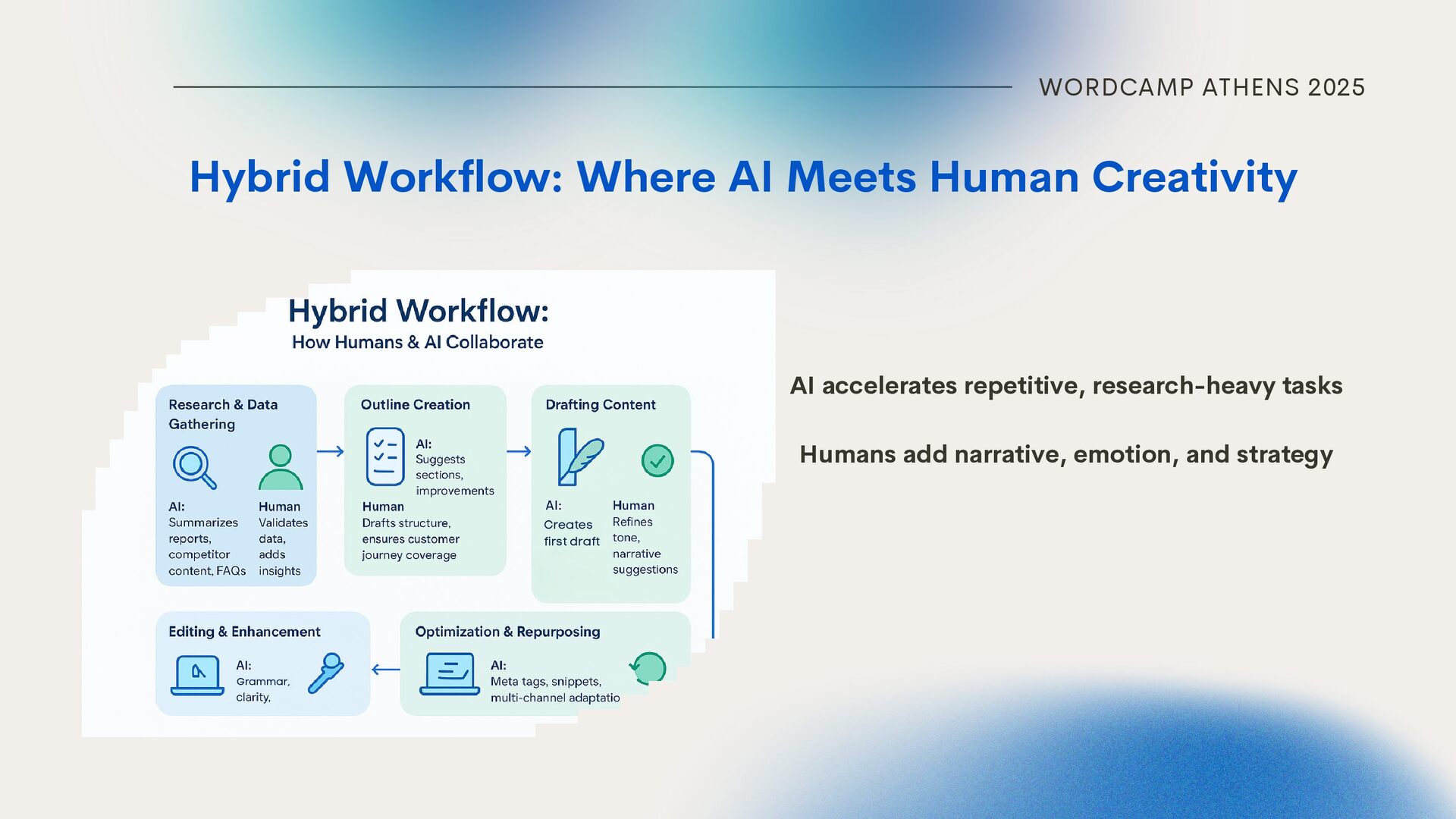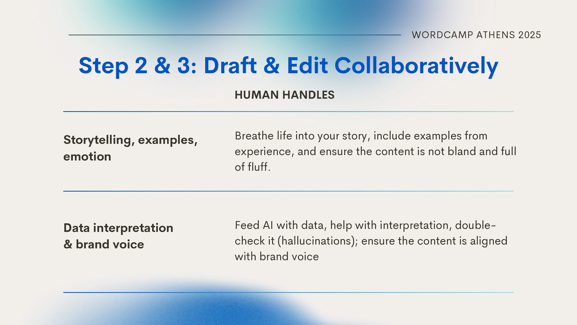 Collaboratively Storytelling, examples, emotion Data interpretation & brand voice Breathe life into your story, include examples from experience, and ensure the content is not bland and full of fluff. HUMAN HANDLES Feed AI with data, help with interpretation, double- check it (hallucinations); ensure the content is aligned with brand voice