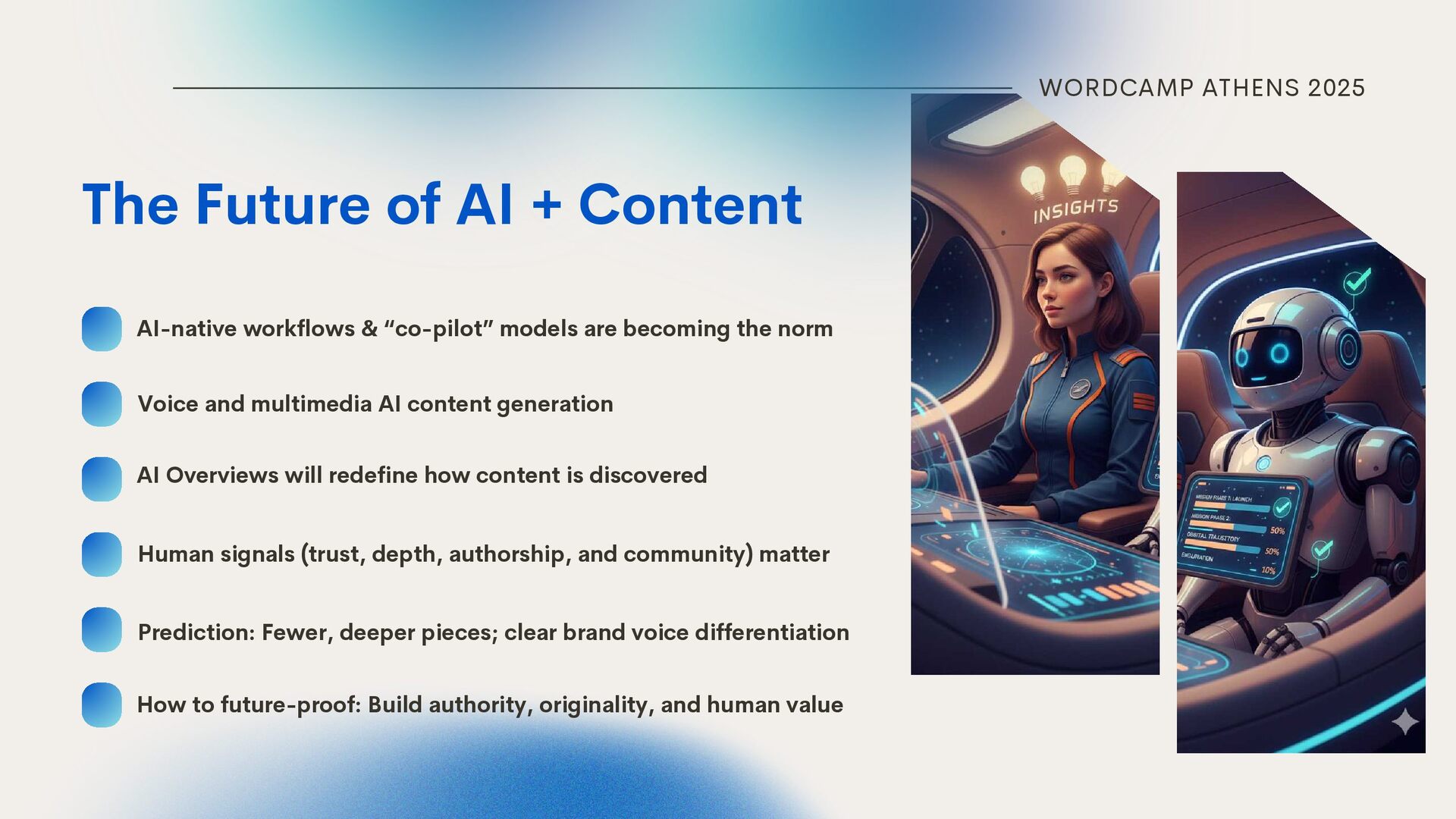 workflows & “co-pilot” models are becoming the norm Voice and multimedia AI content generation Human signals (trust, depth, authorship, and community) matter Prediction: Fewer, deeper pieces; clear brand voice differentiation How to future-proof: Build authority, originality, and human value AI Overviews will redefine how content is discovered