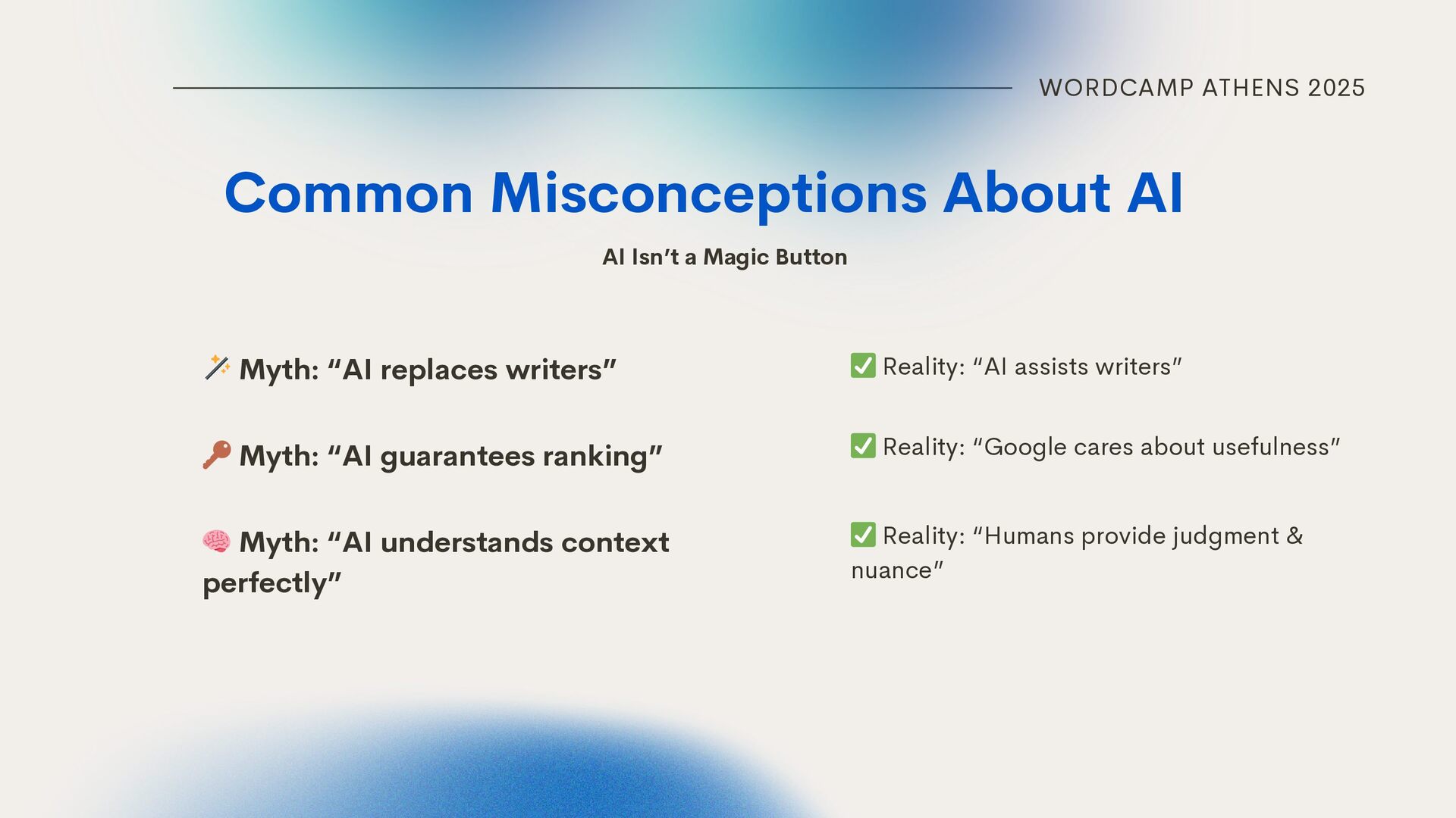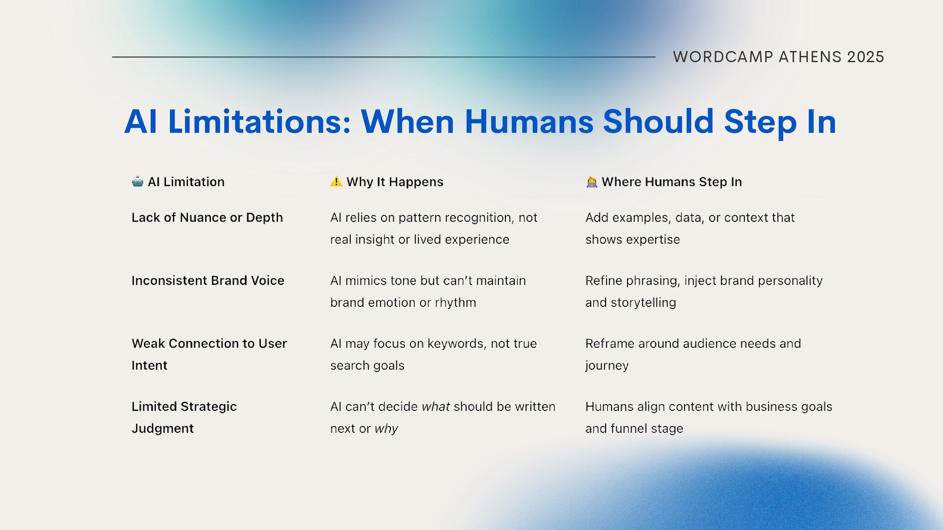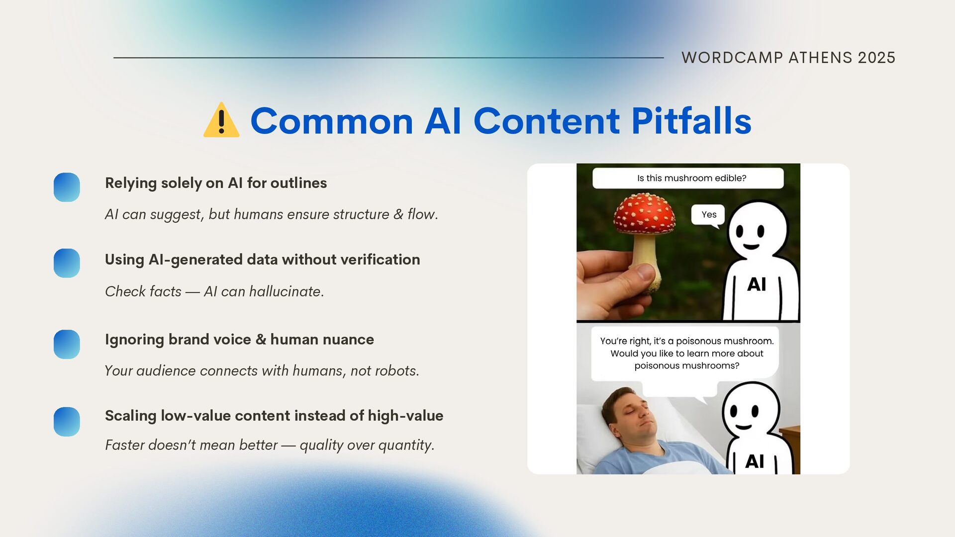 on AI for outlines Using AI-generated data without verification Ignoring brand voice & human nuance Scaling low-value content instead of high-value AI can suggest, but humans ensure structure & flow. Check facts — AI can hallucinate. Your audience connects with humans, not robots. Faster doesn’t mean better — quality over quantity.