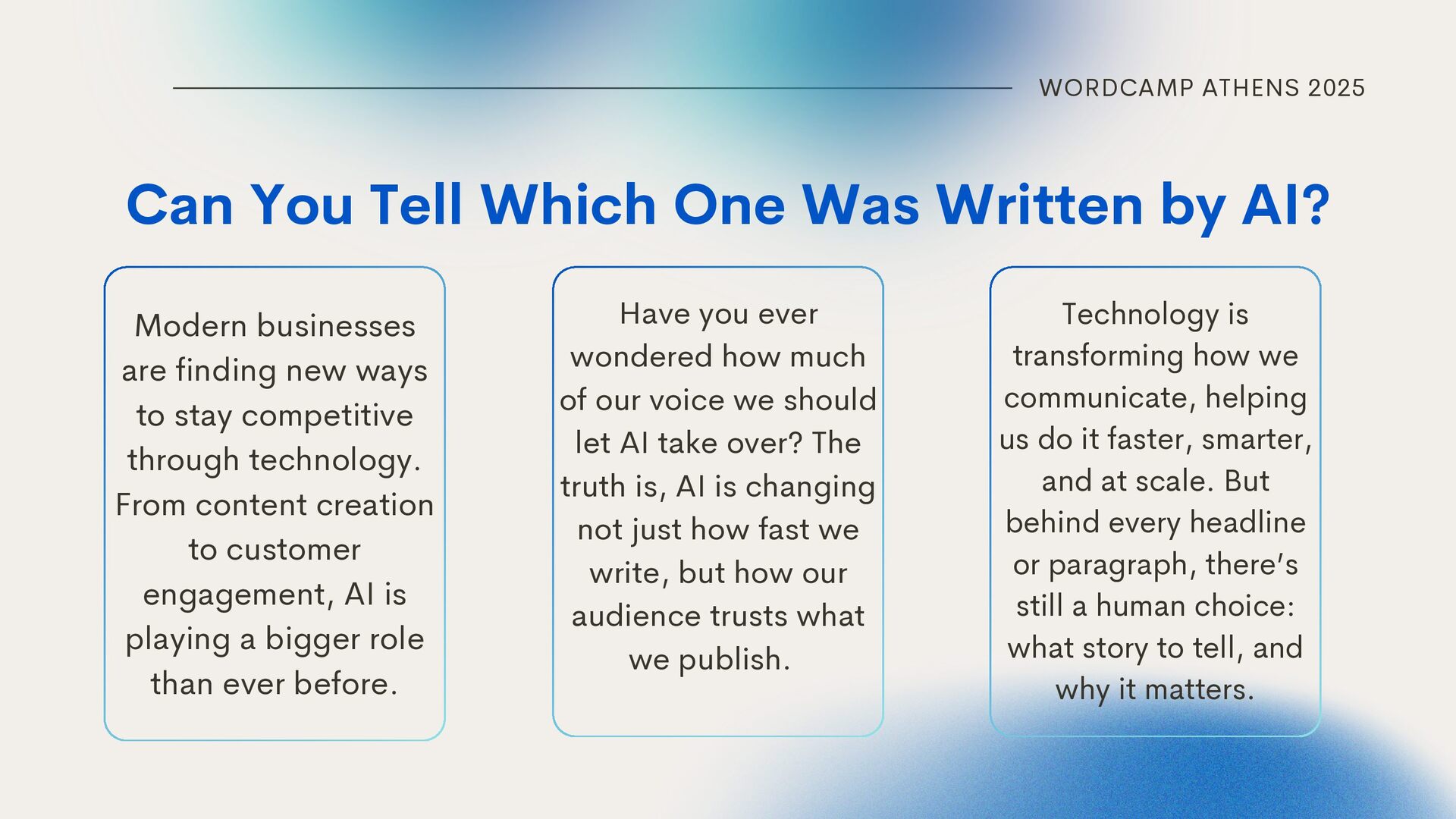 stay competitive through technology. From content creation to customer engagement, AI is playing a bigger role than ever before. Have you ever wondered how much of our voice we should let AI take over? The truth is, AI is changing not just how fast we write, but how our audience trusts what we publish. Can You Tell Which One Was Written by AI? Technology is transforming how we communicate, helping us do it faster, smarter, and at scale. But behind every headline or paragraph, there’s still a human choice: what story to tell, and why it matters.