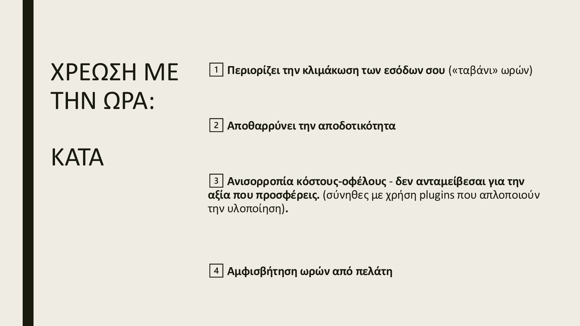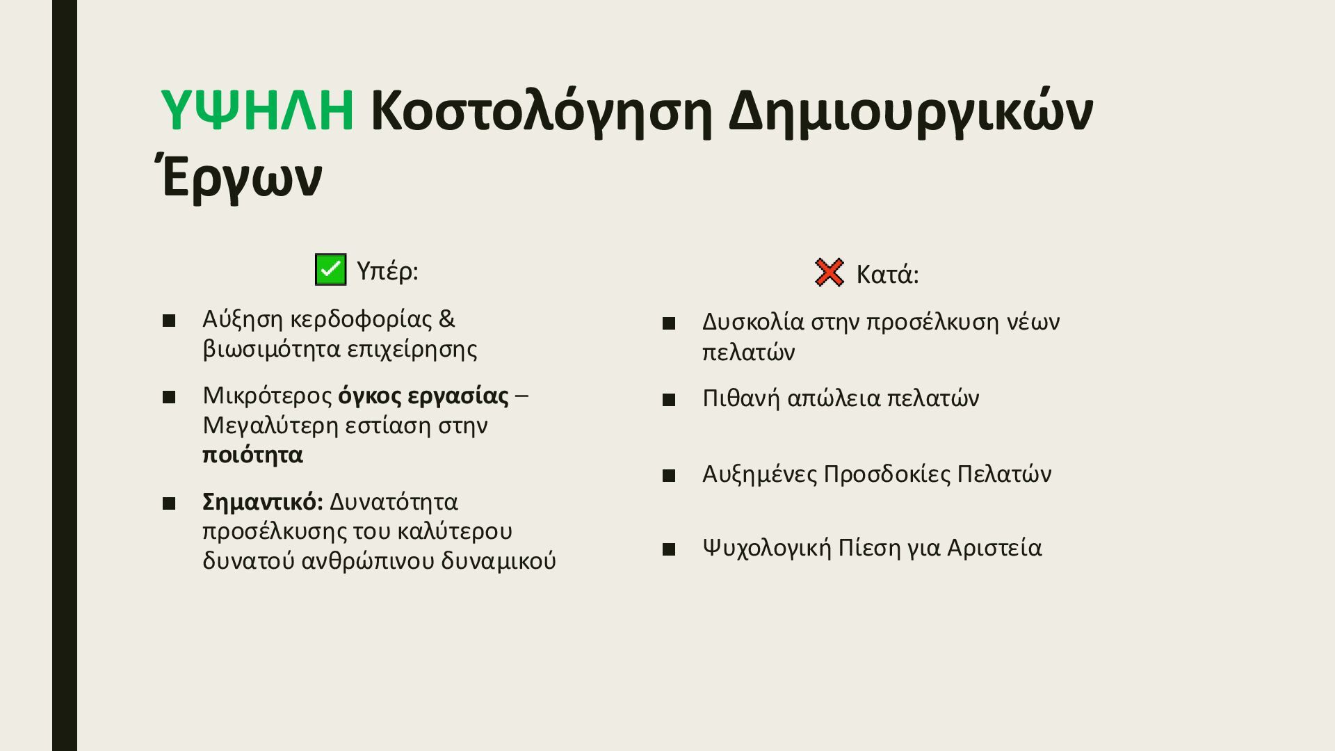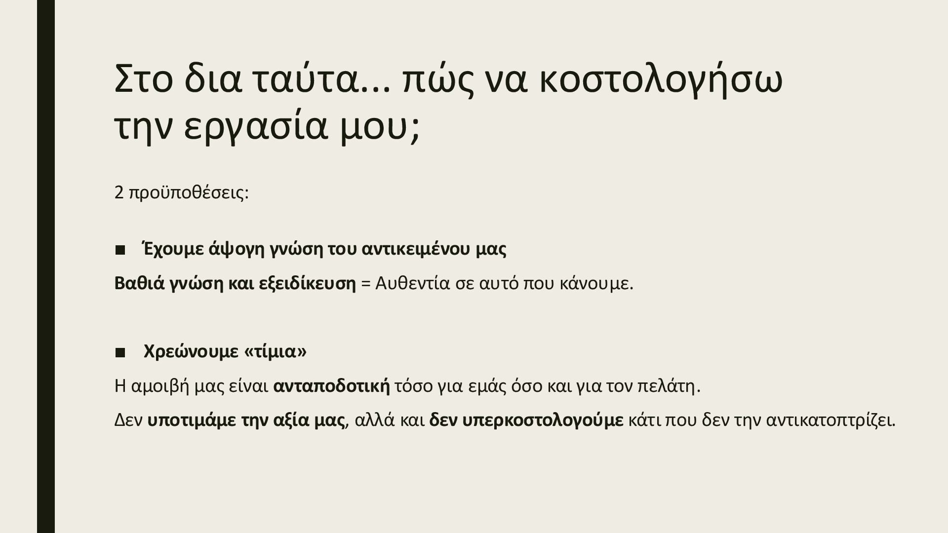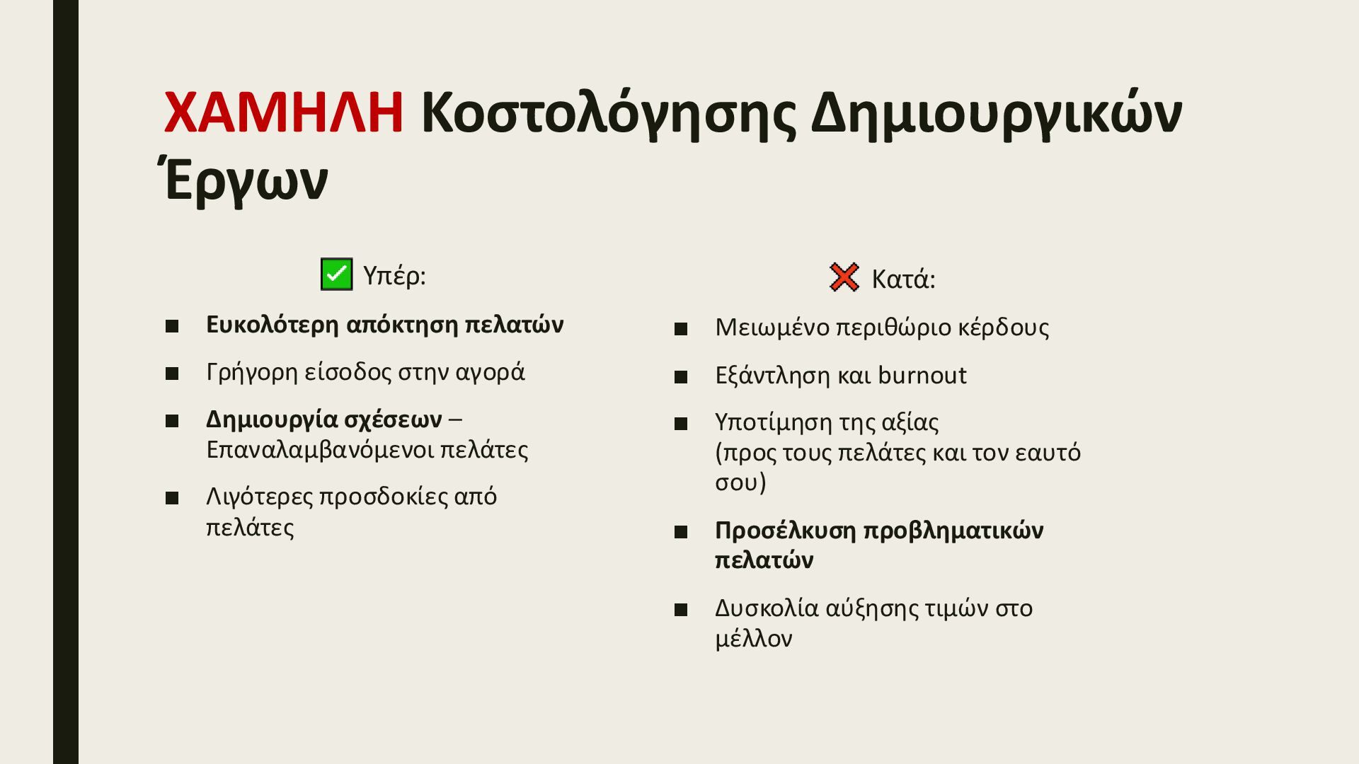 Πρακτικός οδηγός για δημιουργικούς επαγγελματίες και εταιρείες που θέλουν να τιμολογούν τις υπηρεσίες τους. Περιλαμβάνει πρακτικές τακτικές, δοκιμασμένα μοντέλα προσφορών και μεθόδους για να παρουσιάζονται πολλαπλές επιλογές τιμολόγησης στον πελάτη, ενισχύοντας την αντιληπτή αξία και την ψυχολογία της επιλογής.