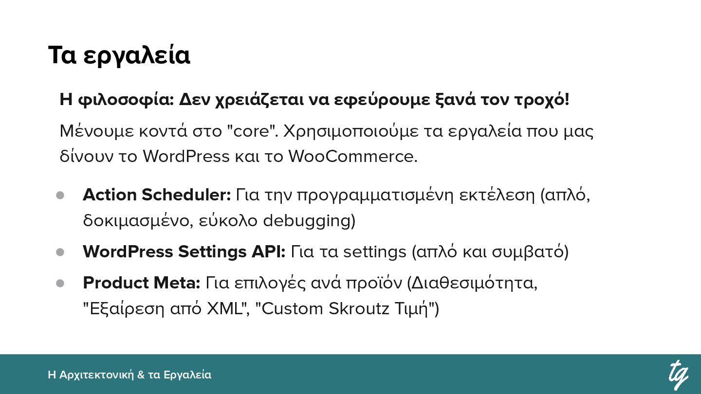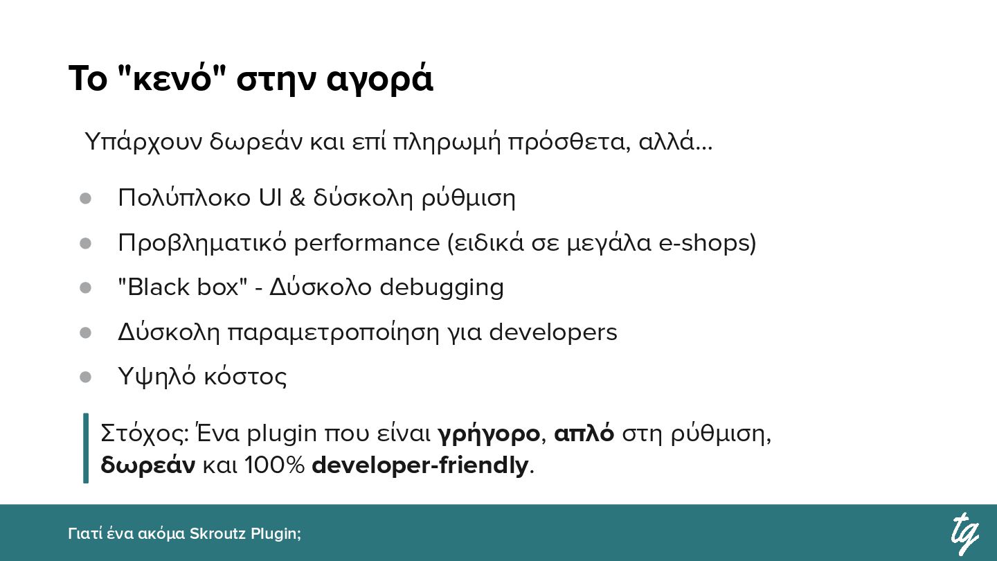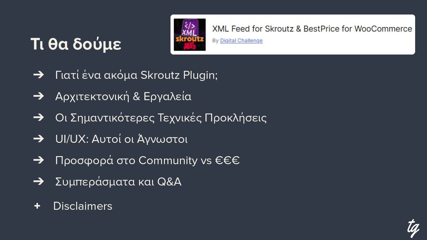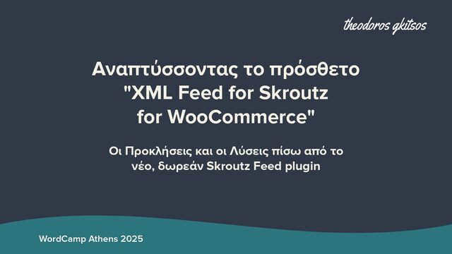 Πώς δημιουργείται ένα plugin που χρησιμοποιούν καθημερινά εκαντοντάδες WooCommerce eshops; Θα δούμε μαζί πώς δημιουργήθηκε το πρόσθετο “XML Feed for Skroutz for WooCommerce” από το μηδέν και ποιες πρακτικές προκλήσεις αντιμετώπισα στη διαδρομή. Από την αποδοτική δημιουργία του feed και την τεχνική βελτιστοποίηση μέχρι τη φροντίδα στο UI για να γίνει εύχρηστο για τον τελικό χρήστη. Η παρουσίαση θα περιλαμβάνει πρακτικά παραδείγματα, προβλήματα που λύθηκαν και συμβουλές για προγραμματιστές που θέλουν να αναπτύξουν plugins με στόχο την απλότητα και την αποτελεσματικότητα, αλλά και πώς να βρουν μια ισορροπία ανάμεσα στην προσφορά στο WordPress Community και το monetization.
