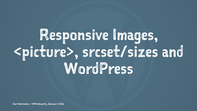 To <picture> And srcset" 4 Jason Grigsby: "Responsive Images 101" 4 Jake Archibald: The anatomy of responsive images 4 Eric Portis on srcset & sizes 4 Bruwe Lawson: "Why we can’t do real responsive images with CSS or JavaScript" Jan Henckens - WPAntwerp, Januari 2016