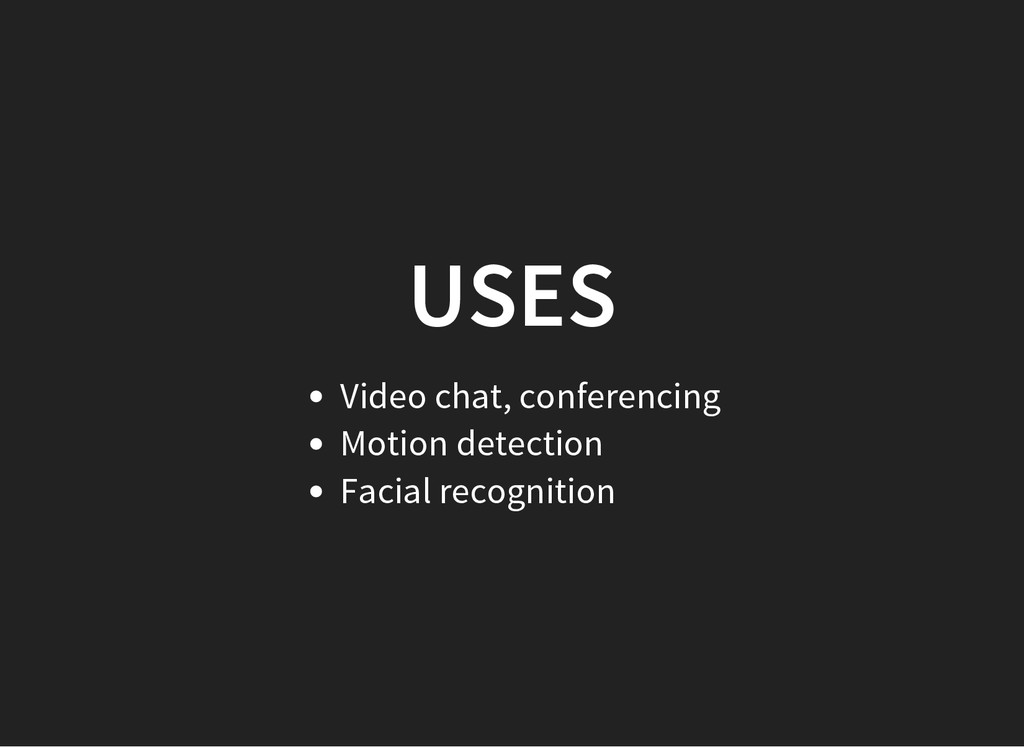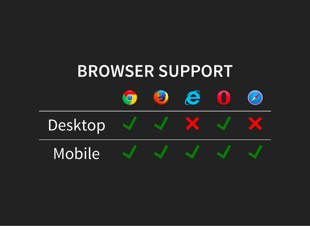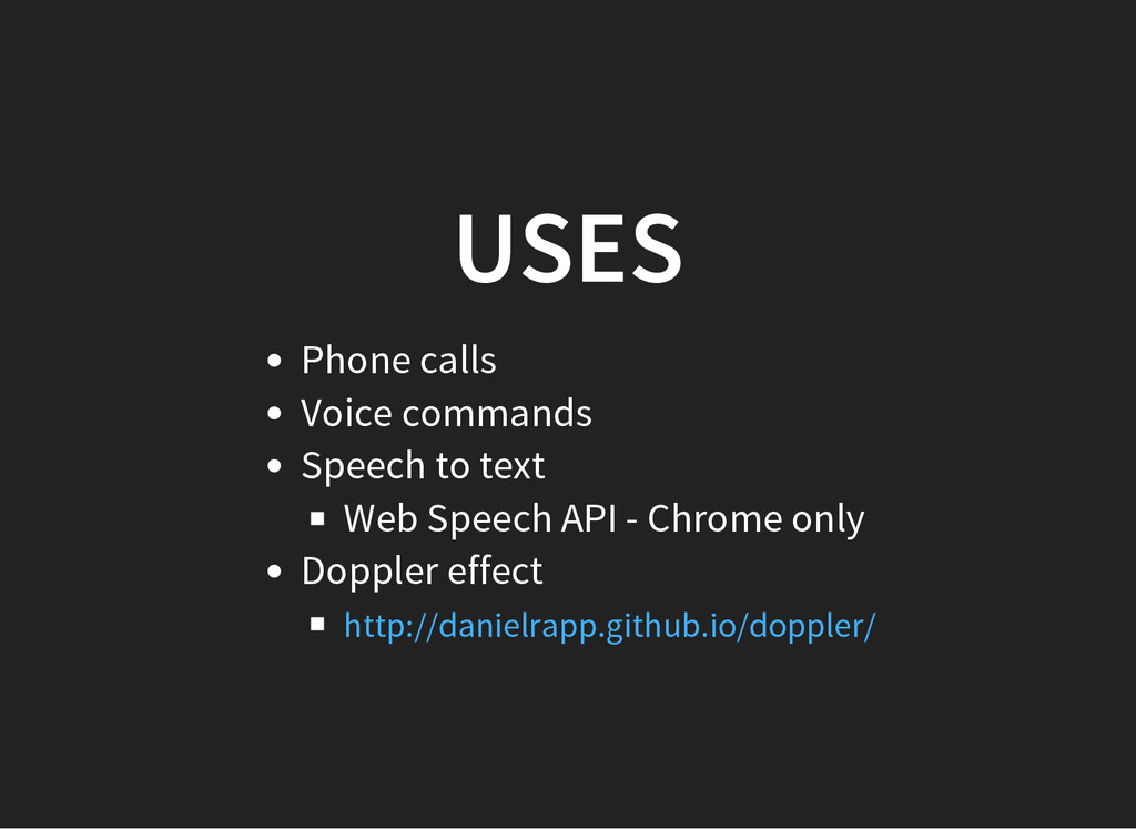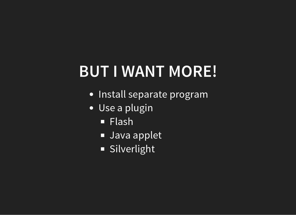, < a u d i o > , < c a n v a s > Native APIs Access device hardware directly from javascript Write once, run anywhere (ish) Still at the mercy of cross browser compatibility Chrome + Firefox around 65% statcounter.com