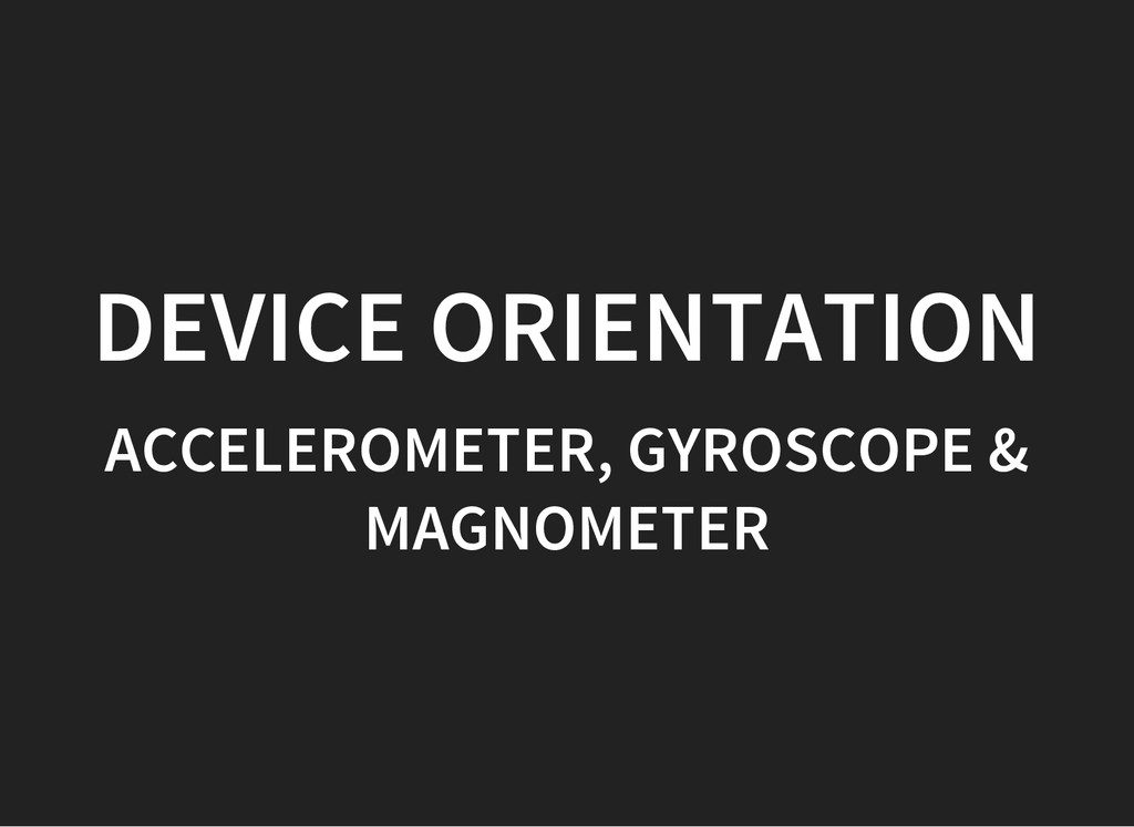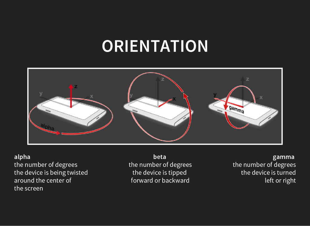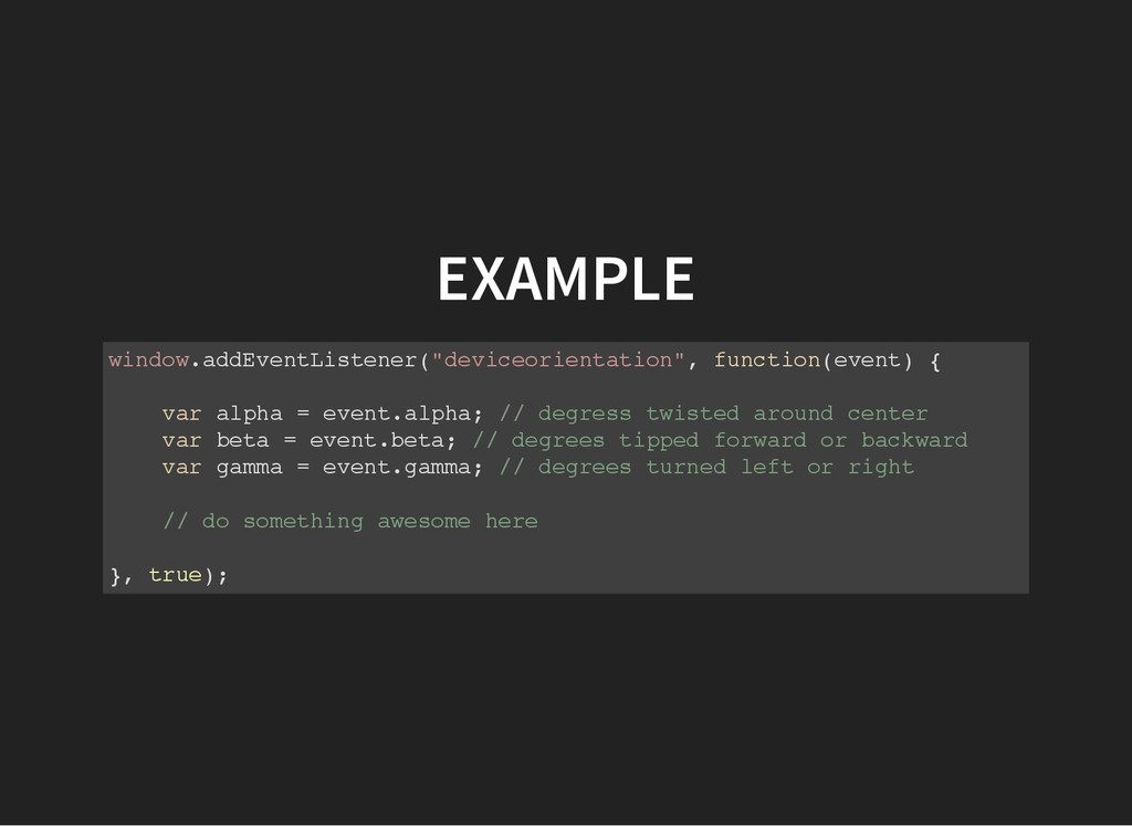 d E v e n t L i s t e n e r ( " d e v i c e o r i e n t a t i o n " , f u n c t i o n ( e v e n t ) { v a r a l p h a = e v e n t . a l p h a ; / / d e g r e s s t w i s t e d a r o u n d c e n t e r v a r b e t a = e v e n t . b e t a ; / / d e g r e e s t i p p e d f o r w a r d o r b a c k w a r d v a r g a m m a = e v e n t . g a m m a ; / / d e g r e e s t u r n e d l e f t o r r i g h t / / d o s o m e t h i n g a w e s o m e h e r e } , t r u e ) ;