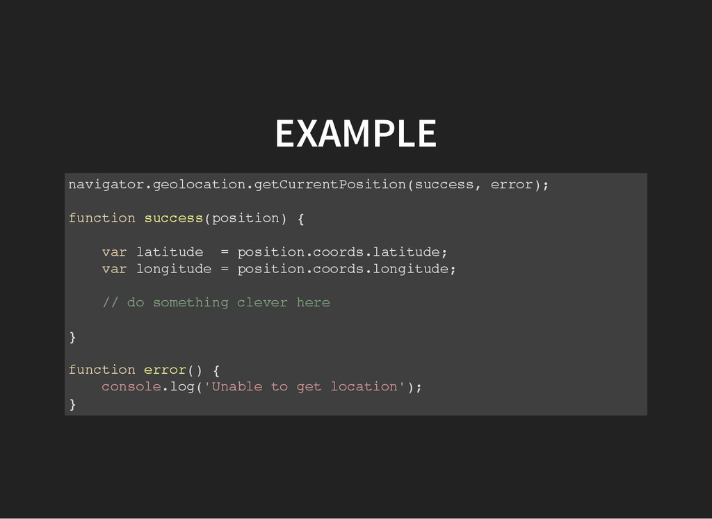 . g e o l o c a t i o n . g e t C u r r e n t P o s i t i o n ( s u c c e s s , e r r o r ) ; f u n c t i o n s u c c e s s ( p o s i t i o n ) { v a r l a t i t u d e = p o s i t i o n . c o o r d s . l a t i t u d e ; v a r l o n g i t u d e = p o s i t i o n . c o o r d s . l o n g i t u d e ; / / d o s o m e t h i n g c l e v e r h e r e } f u n c t i o n e r r o r ( ) { c o n s o l e . l o g ( ' U n a b l e t o g e t l o c a t i o n ' ) ; }