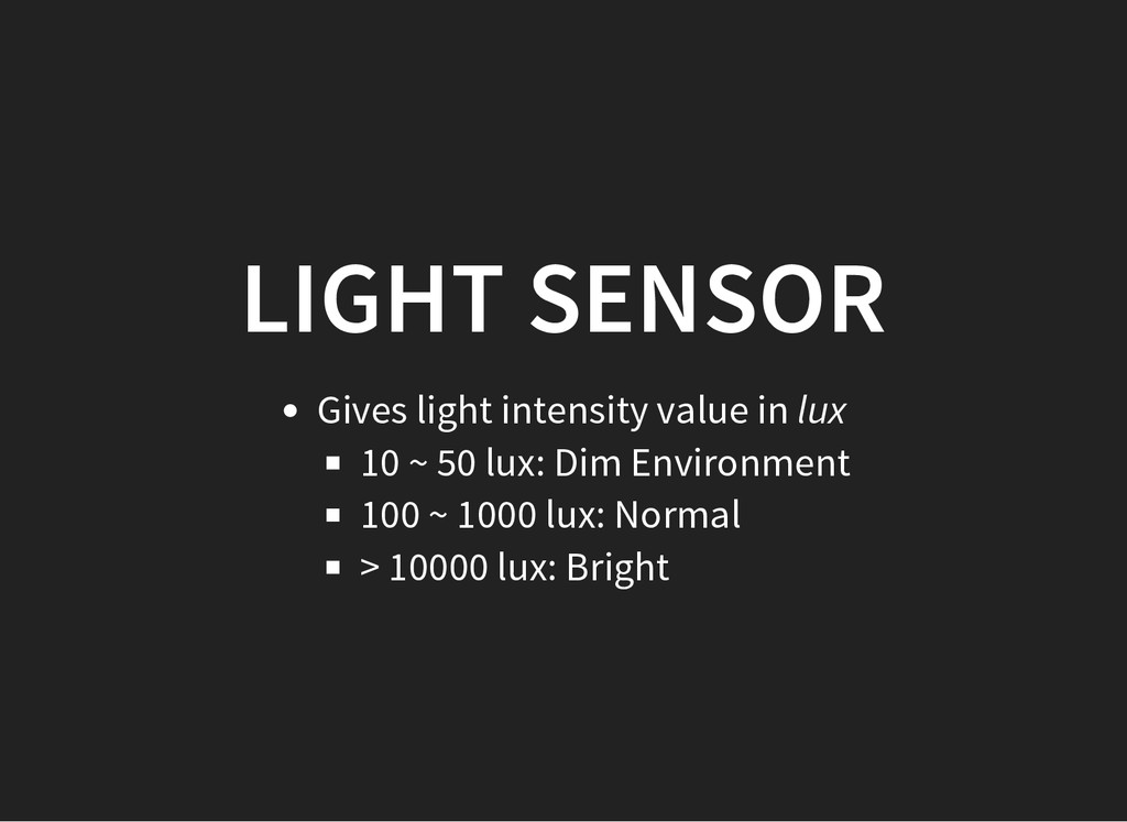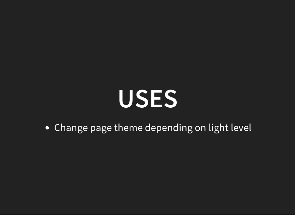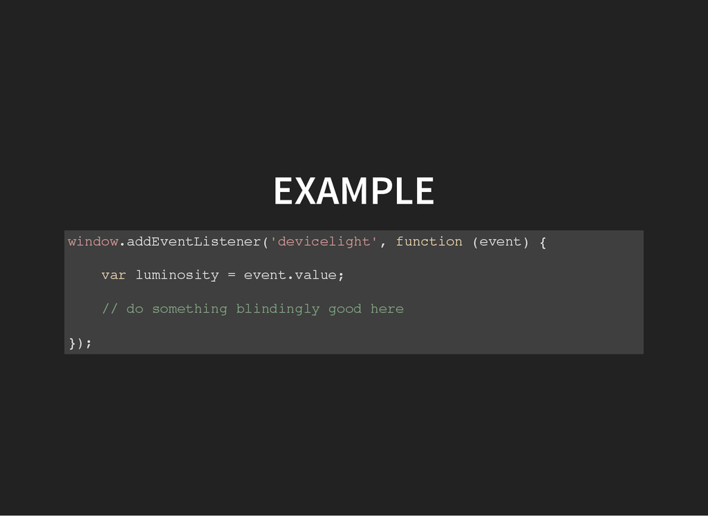 d E v e n t L i s t e n e r ( ' d e v i c e l i g h t ' , f u n c t i o n ( e v e n t ) { v a r l u m i n o s i t y = e v e n t . v a l u e ; / / d o s o m e t h i n g b l i n d i n g l y g o o d h e r e } ) ;