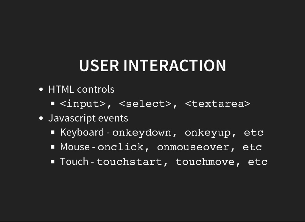 > , < s e l e c t > , < t e x t a r e a > Javascript events Keyboard - o n k e y d o w n , o n k e y u p , e t c Mouse - o n c l i c k , o n m o u s e o v e r , e t c Touch - t o u c h s t a r t , t o u c h m o v e , e t c