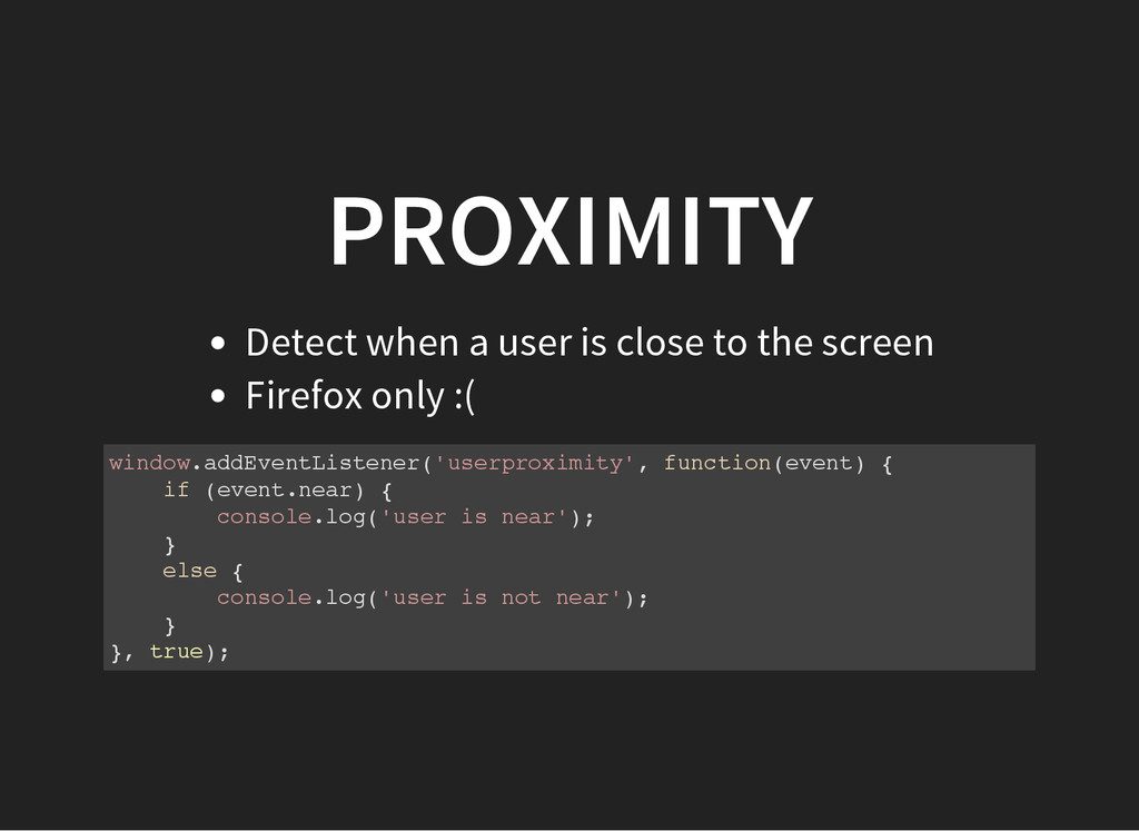 Firefox only :( w i n d o w . a d d E v e n t L i s t e n e r ( ' u s e r p r o x i m i t y ' , f u n c t i o n ( e v e n t ) { i f ( e v e n t . n e a r ) { c o n s o l e . l o g ( ' u s e r i s n e a r ' ) ; } e l s e { c o n s o l e . l o g ( ' u s e r i s n o t n e a r ' ) ; } } , t r u e ) ;