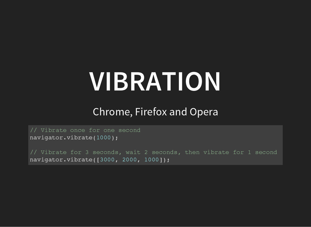 r a t e o n c e f o r o n e s e c o n d n a v i g a t o r . v i b r a t e ( 1 0 0 0 ) ; / / V i b r a t e f o r 3 s e c o n d s , w a i t 2 s e c o n d s , t h e n v i b r a t e f o r 1 s e c o n d n a v i g a t o r . v i b r a t e ( [ 3 0 0 0 , 2 0 0 0 , 1 0 0 0 ] ) ;