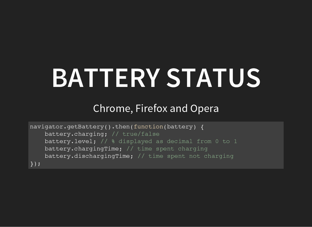 g a t o r . g e t B a t t e r y ( ) . t h e n ( f u n c t i o n ( b a t t e r y ) { b a t t e r y . c h a r g i n g ; / / t r u e / f a l s e b a t t e r y . l e v e l ; / / % d i s p l a y e d a s d e c i m a l f r o m 0 t o 1 b a t t e r y . c h a r g i n g T i m e ; / / t i m e s p e n t c h a r g i n g b a t t e r y . d i s c h a r g i n g T i m e ; / / t i m e s p e n t n o t c h a r g i n g } ) ;
