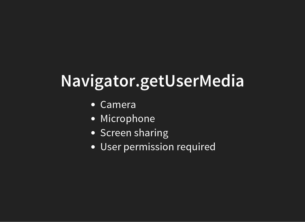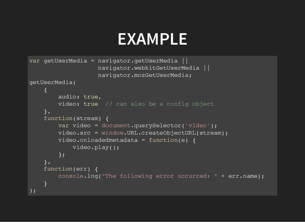 r M e d i a = n a v i g a t o r . g e t U s e r M e d i a | | n a v i g a t o r . w e b k i t G e t U s e r M e d i a | | n a v i g a t o r . m o z G e t U s e r M e d i a ; g e t U s e r M e d i a ( { a u d i o : t r u e , v i d e o : t r u e / / c a n a l s o b e a c o n f i g o b j e c t } , f u n c t i o n ( s t r e a m ) { v a r v i d e o = d o c u m e n t . q u e r y S e l e c t o r ( ' v i d e o ' ) ; v i d e o . s r c = w i n d o w . U R L . c r e a t e O b j e c t U R L ( s t r e a m ) ; v i d e o . o n l o a d e d m e t a d a t a = f u n c t i o n ( e ) { v i d e o . p l a y ( ) ; } ; } , f u n c t i o n ( e r r ) { c o n s o l e . l o g ( " T h e f o l l o w i n g e r r o r o c c u r r e d : " + e r r . n a m e ) ; } ) ;