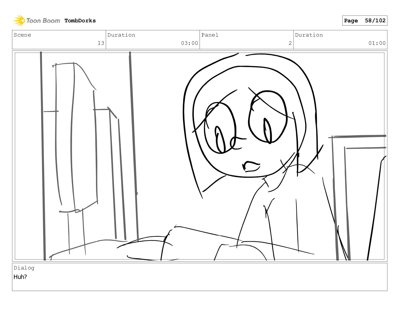Scene 13 Duration 03:00 Panel 2 Duration 01:00 Dialog Huh?