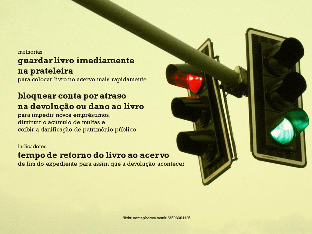 acervo mais rapidamente bloquear conta por atraso na devolução ou dano ao livro para impedir novos empréstimos, diminuir o acúmulo de multas e coibir a danificação de patrimônio público indicadores tempo de retorno do livro ao acervo de fim do expediente para assim que a devolução acontecer flickr.com/photos/tasuki/3503304405