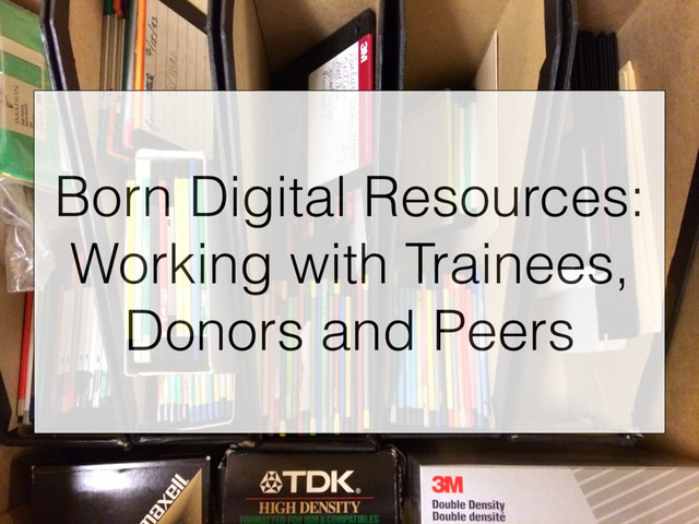 This presentation focuses on a) resources I've used to educate and train students working with born-digital media in an archival setting, b) resources I’ve used to promote born-digital media preservation, and c) my experiences working with donors of born-digital media in identifying potential archive materials and in transferring those materials. Presented at SAA 2014.