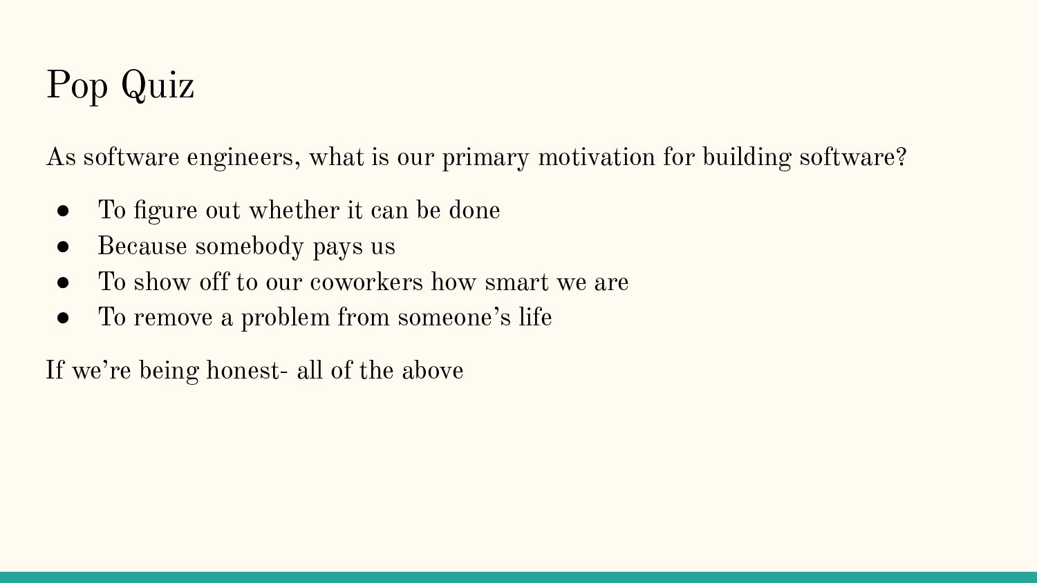 for building software? • To figure out whether it can be done • Because somebody pays us • To show off to our coworkers how smart we are • To remove a problem from someone’s life If we’re being honest- all of the above