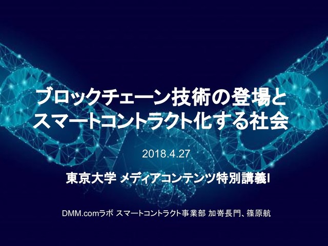 ブロックチェーン技術の登場と スマートコントラクト化する社会 東京大学 メディアコンテンツ特別講義I 2018.4.27 DMM.comラボ スマートコントラクト事業部 加嵜長門、篠原航