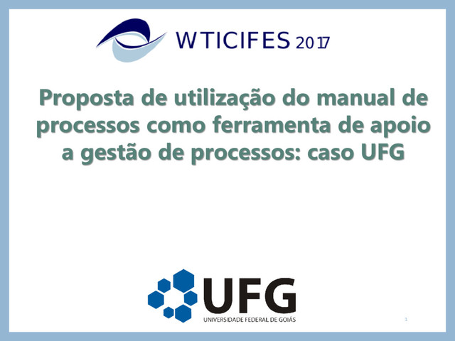 da UFG que possui como um dos seus desafios a gestão de processos; •Identificou-se a necessidade em adotar um método que pudesse auxiliar a efetividade da gestão de processos. 6