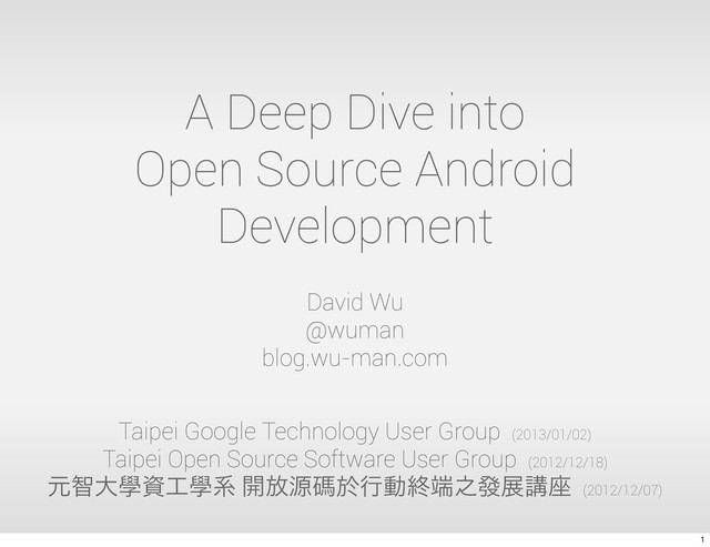 The increasing popularity of the Android platform over the past two years has encouraged many talented developers to contribute. Developers no longer need to invent their own wheels from scratch. Instead, many open source tools and libraries are becoming available for Android developers. In this talk we will take a deep dive into Android programming and how developers can leverage open source tools to bootstrap their Android apps. We will also talk about how developers can contribute back to the open source community.