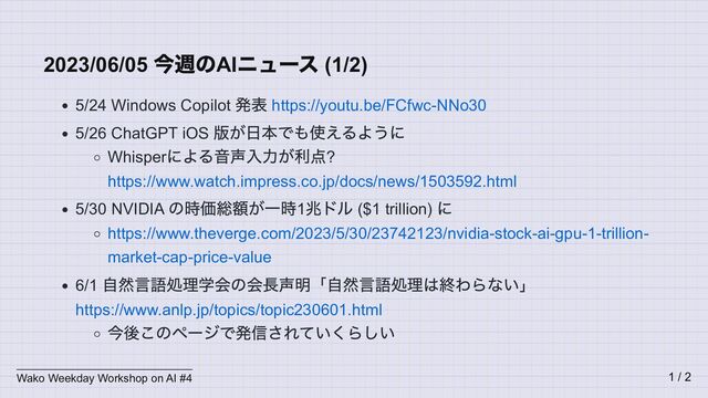 5/26 ChatGPT iOS 版が日本でも使えるように Whisper による音声入力が利点? https://www.watch.impress.co.jp/docs/news/1503592.html 5/30 NVIDIA の時価総額が一時1 兆ドル ($1 trillion) に https://www.theverge.com/2023/5/30/23742123/nvidia-stock-ai-gpu-1-trillion- market-cap-price-value 6/1 自然言語処理学会の会長声明「自然言語処理は終わらない」 https://www.anlp.jp/topics/topic230601.html 今後このページで発信されていくらしい Wako Weekday Workshop on AI #4 1 / 2