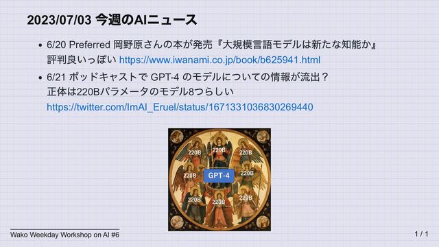 ポッドキャストで GPT-4 のモデルについての情報が流出? 正体は220B パラメータのモデル8 つらしい https://twitter.com/ImAI_Eruel/status/1671331036830269440 Wako Weekday Workshop on AI #6 1 / 1