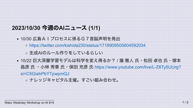10/22 巨大深層学習モデルは科学を変え得るか? / 瀧 雅人 氏・松田 卓也 氏・塚本 昌彦 氏 ・小林 秀章 氏・保田 充彦 氏 https://www.youtube.com/live/L-Z6Ty5UUrg? si=C5GiahPbYTpwpmQJ ナレッジキャピタル主催。すごい組み合わせ。 Wako Weekday Workshop on AI #14 1 / 2