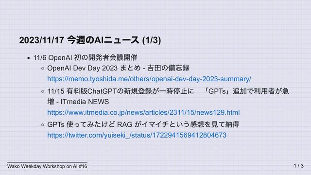 AI 天気予報論文が Science に掲載 https://www.science.org/doi/10.1126/science.adi2336 解説 https://twitter.com/kohyama_met/status/1724986380546408878 GNN を利用 11/8 ASCII.jp :アマゾン、ChatGPT (GPT-4 )超えのAI モデル開発か その名も 「Olympus 」 https://ascii.jp/elem/000/004/168/4168394/ 11/14 西村経済産業大臣が、AI ・半導体企業トップとの意見交換会に出席しました (METI/ 経済産業省) https://www.meti.go.jp/press/2023/11/20231114004/20231114004.html いつも革ジャンのジェンスン・フアンがスーツ、ジム・ケラーだけ普段着 Wako Weekday Workshop on AI #16 3 / 3