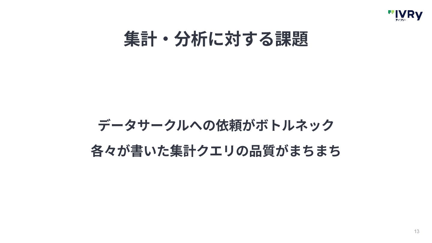 13 集計‧分析に対する課題 データサークルへの依頼がボトルネック 各々が書いた集計クエリの品質がまちまち