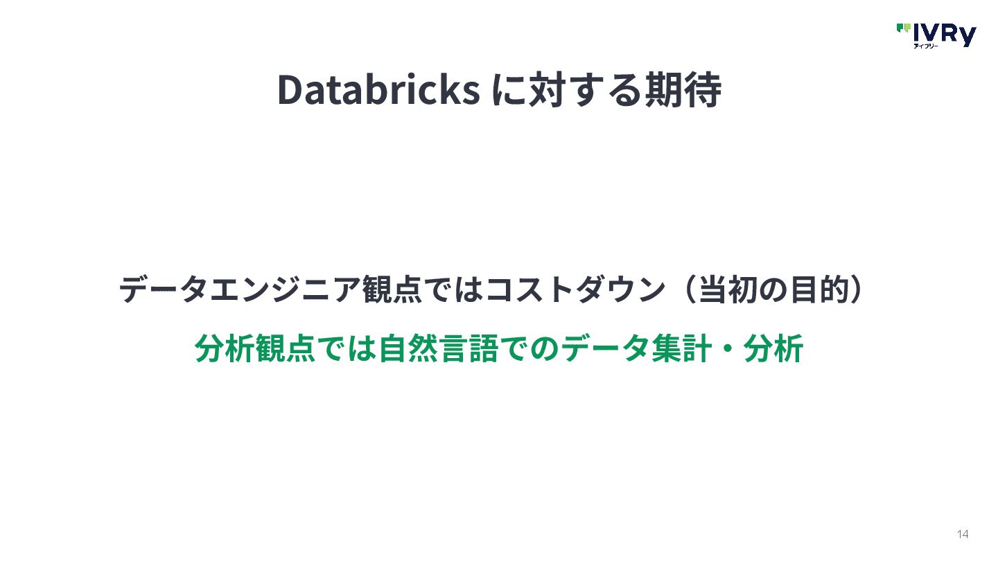 14 Databricks に対する期待 データエンジニア観点ではコストダウン(当初の⽬的) 分析観点では⾃然⾔語でのデータ集計‧分析