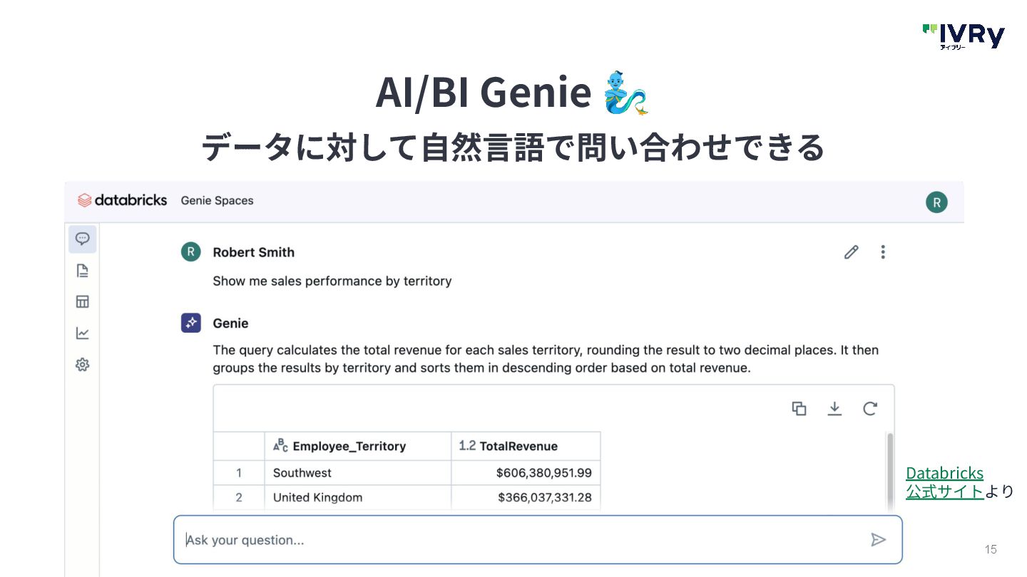 15 AI/BI Genie データに対して⾃然⾔語で問い合わせできる Databricks 公式サイトより