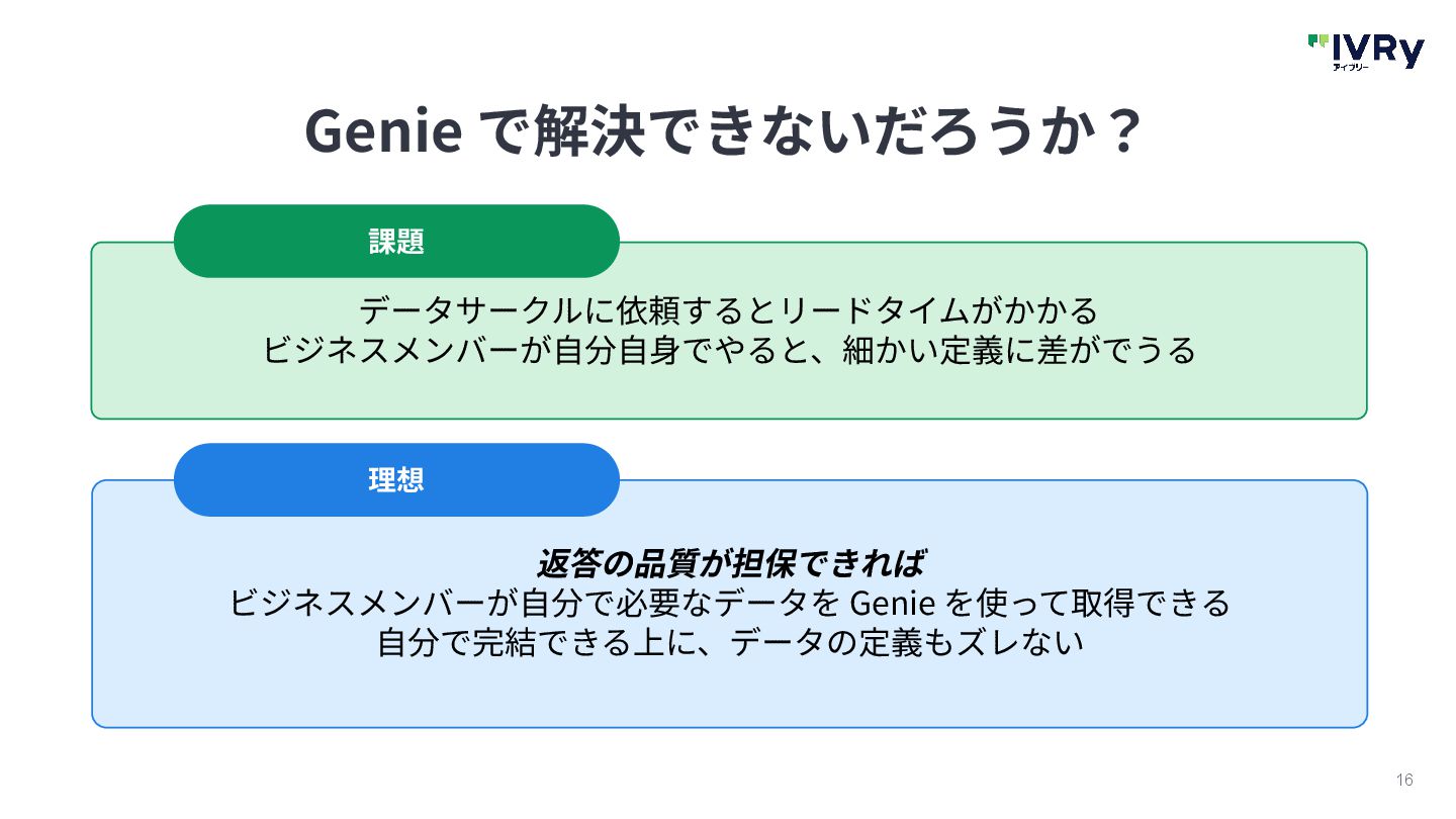 データサークルに依頼するとリードタイムがかかる ビジネスメンバーが⾃分⾃⾝でやると、細かい定義に差がでうる 課題 Genie で解決できないだろうか? 16 返答の品質が担保できれば ビジネスメンバーが⾃分で必要なデータを Genie を使って取得できる