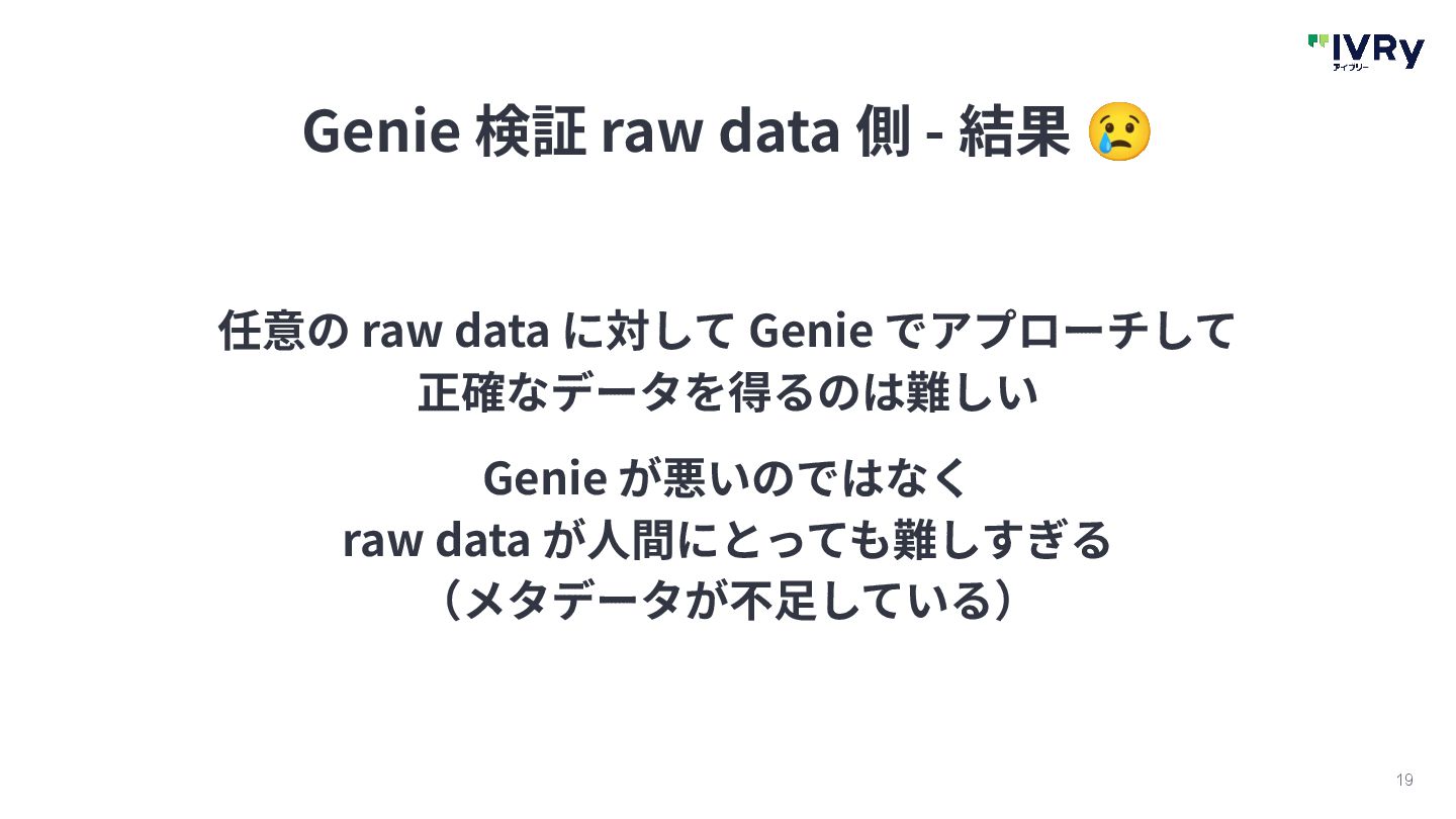 raw data に対して Genie でアプローチして 正確なデータを得るのは難しい Genie が悪いのではなく raw data が⼈間にとっても難しすぎる (メタデータが不⾜している)