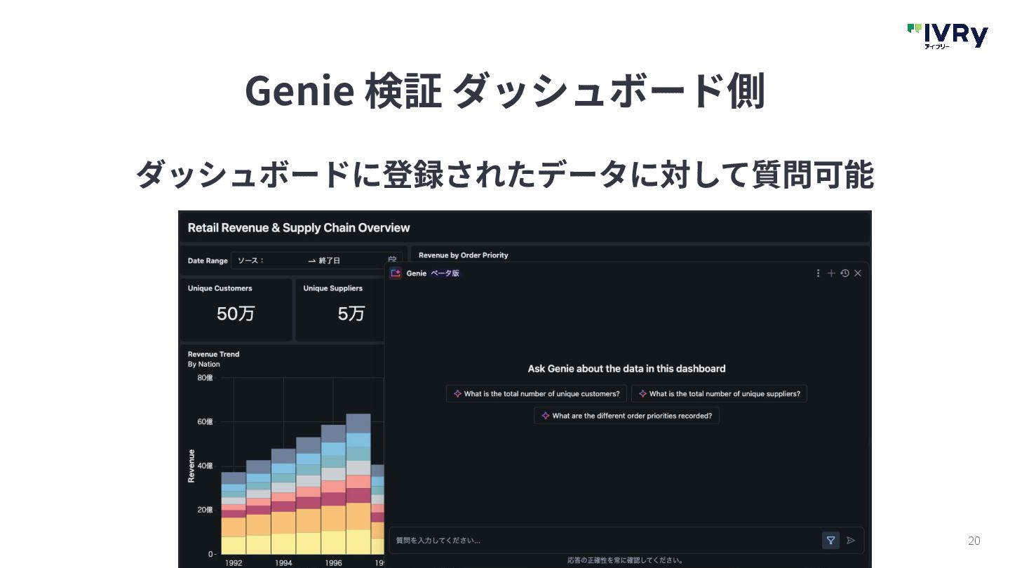 20 Genie 検証 ダッシュボード側 ダッシュボードに登録されたデータに対して質問可能