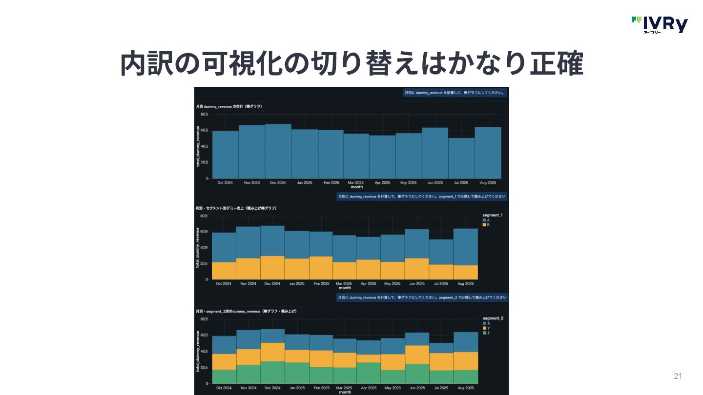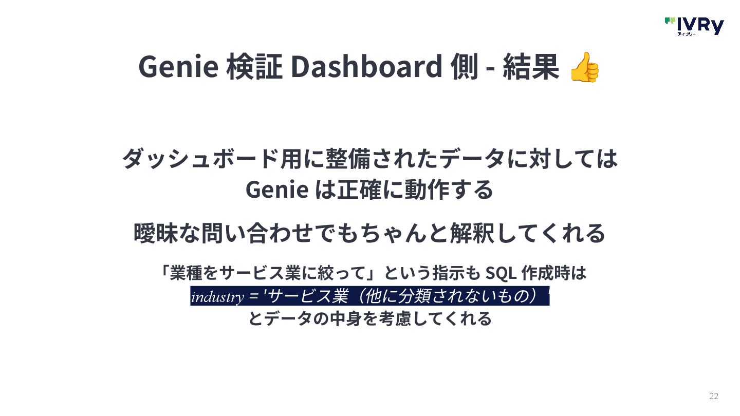とデータの中⾝を考慮してくれる 22 Genie 検証 Dashboard 側 - 結果 👍