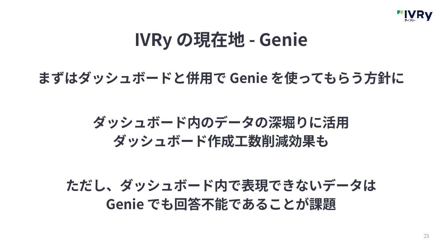 23 IVRy の現在地 - Genie まずはダッシュボードと併⽤で Genie を使ってもらう⽅針に ダッシュボード内のデータの深堀りに活⽤ ダッシュボード作成⼯数削減効果も