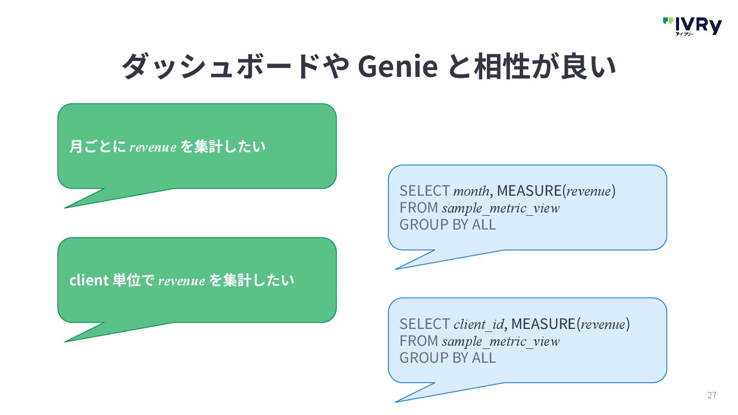 27 ダッシュボードや Genie と相性が良い SELECT month, MEASURE(revenue) FROM sample_metric_view GROUP