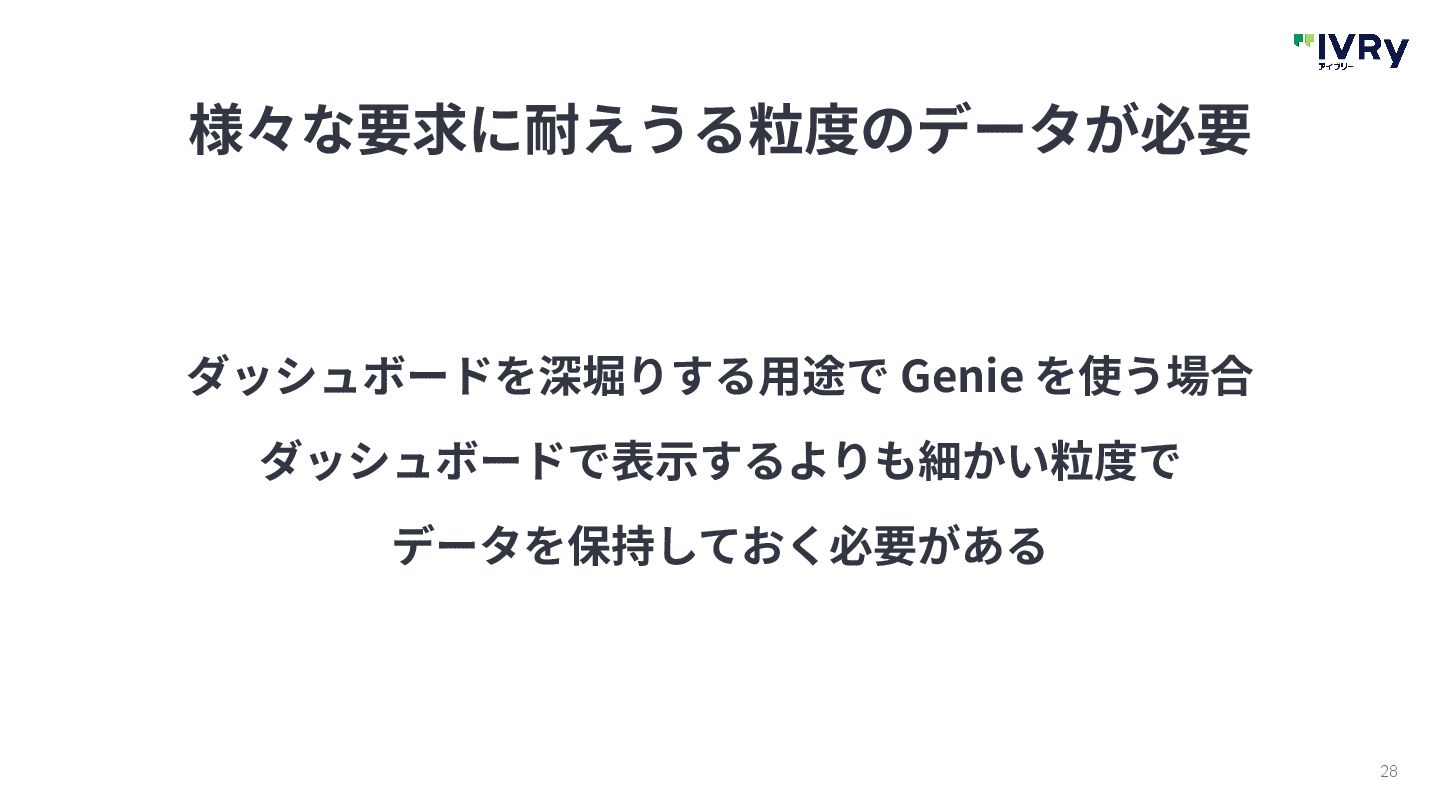 28 様々な要求に耐えうる粒度のデータが必要 ダッシュボードを深堀りする⽤途で Genie を使う場合 ダッシュボードで表⽰するよりも細かい粒度で データを保持しておく必要がある