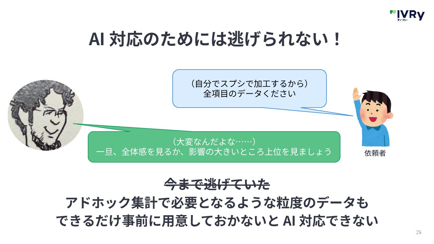 今まで逃げていた アドホック集計で必要となるような粒度のデータも できるだけ事前に⽤意しておかないと AI 対応できない 29 AI 対応のためには逃げられない! (⾃分でスプシで加⼯するから) 全項⽬のデータください