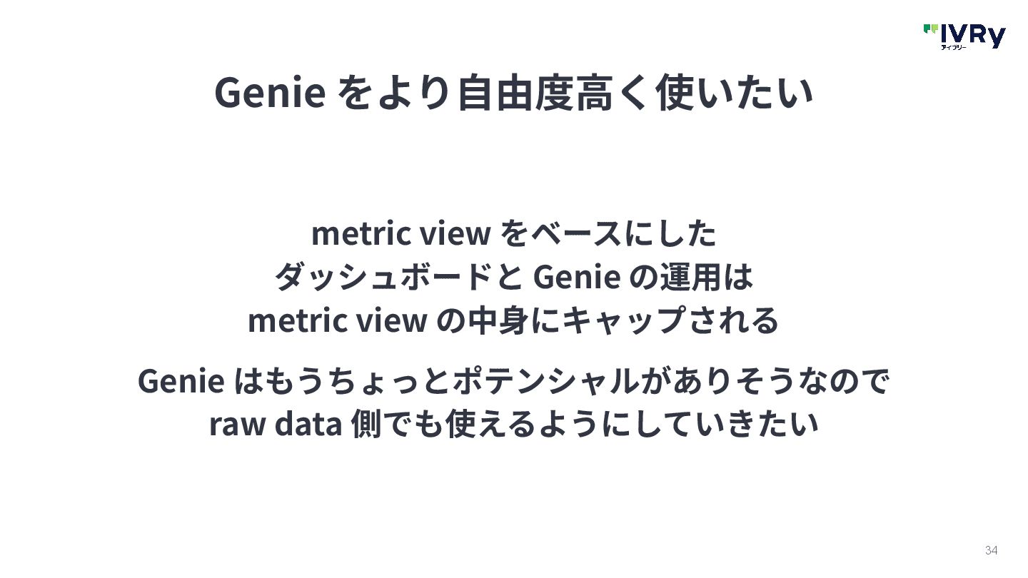 34 Genie をより⾃由度⾼く使いたい metric view をベースにした ダッシュボードと Genie の運⽤は metric