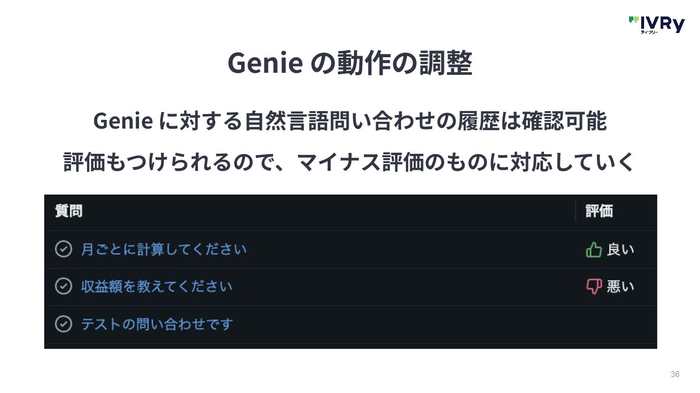 36 Genie の動作の調整 Genie に対する⾃然⾔語問い合わせの履歴は確認可能 評価もつけられるので、マイナス評価のものに対応していく