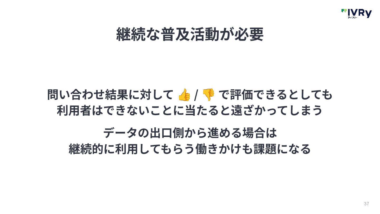 37 継続な普及活動が必要 問い合わせ結果に対して 👍 / 👎 で評価できるとしても 利⽤者はできないことに当たると遠ざかってしまう データの出⼝側から進める場合は 継続的に利⽤してもらう働きかけも課題になる