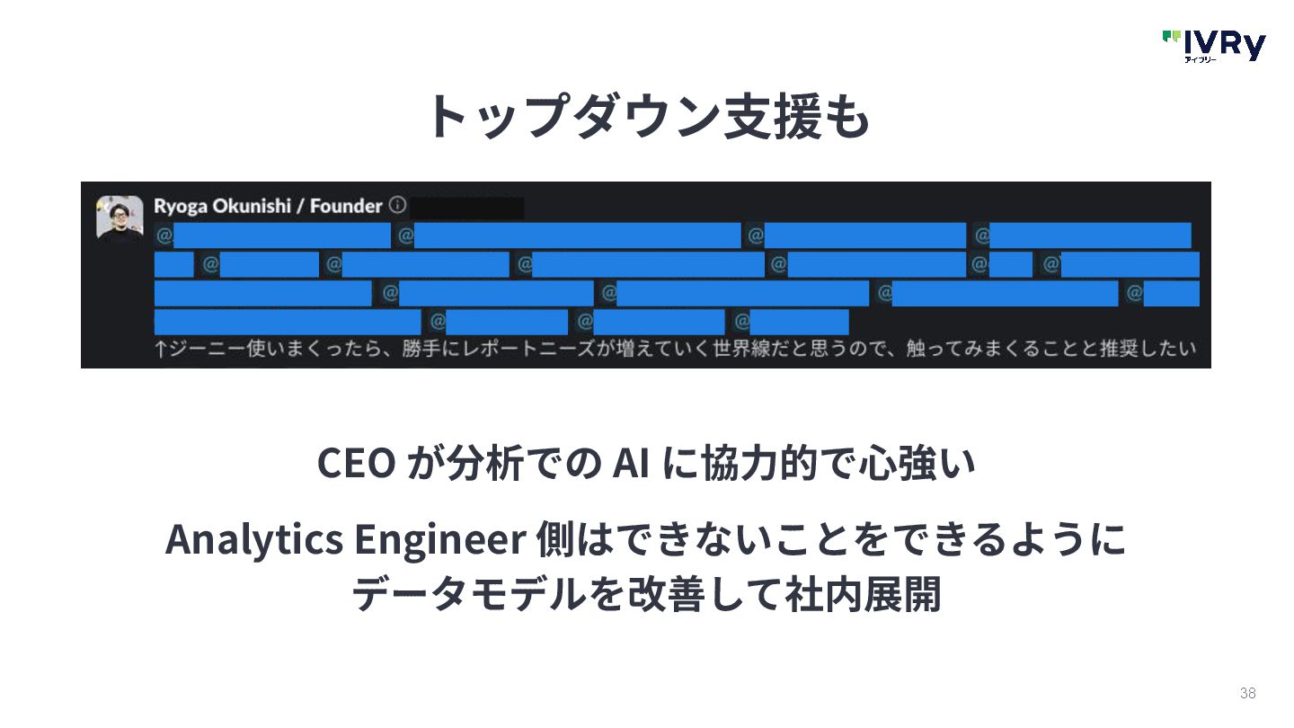 CEO が分析での AI に協⼒的で⼼強い Analytics Engineer 側はできないことをできるように データモデルを改善して社内展開 38 トップダウン⽀援も