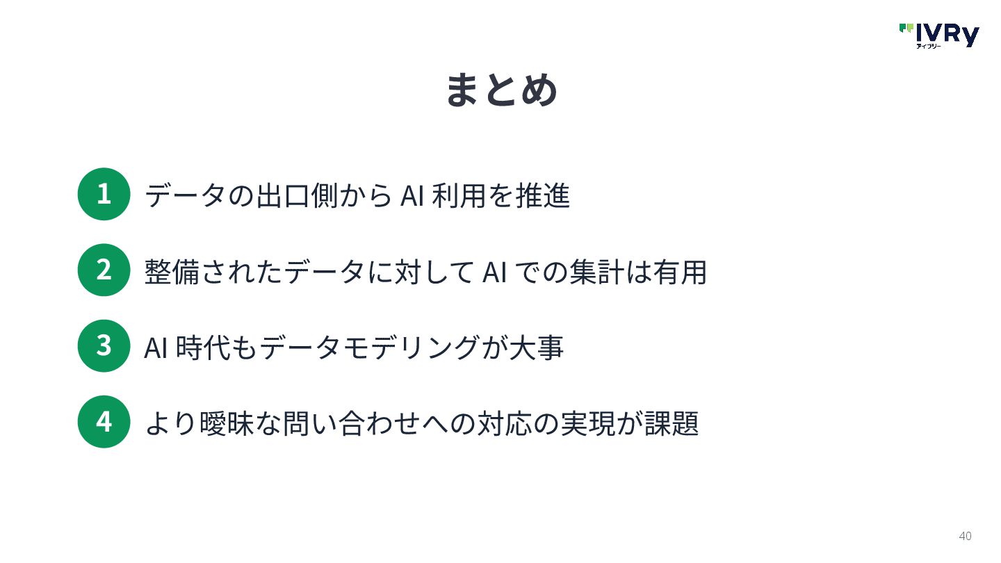 40 まとめ データの出⼝側から AI 利⽤を推進 1 整備されたデータに対して AI での集計は有⽤ 2