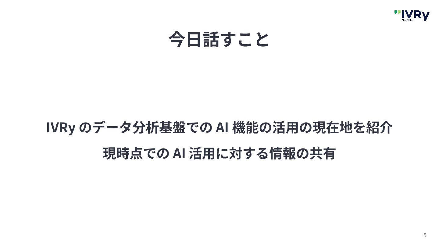 5 今⽇話すこと IVRy のデータ分析基盤での AI 機能の活⽤の現在地を紹介 現時点での AI 活⽤に対する情報の共有