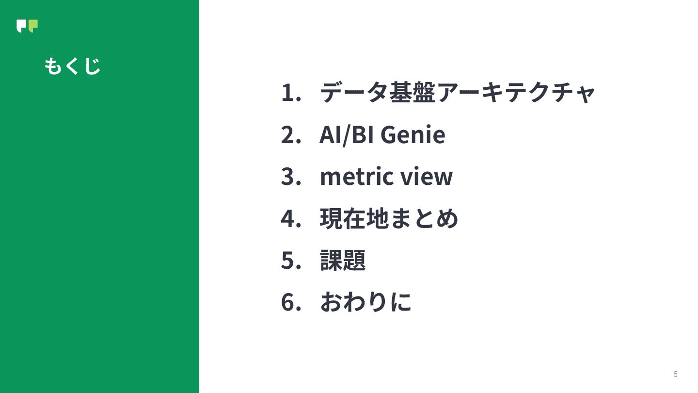 6 もくじ 1. データ基盤アーキテクチャ 2. AI/BI Genie 3. metric view