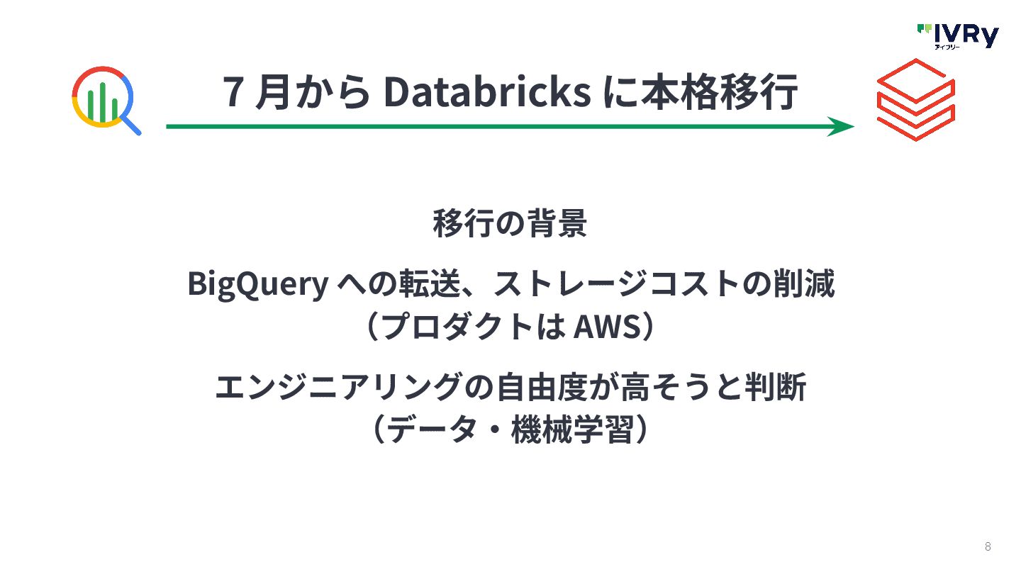 8 7 ⽉から Databricks に本格移⾏ 移⾏の背景 BigQuery への転送、ストレージコストの削減 (プロダクトは AWS)