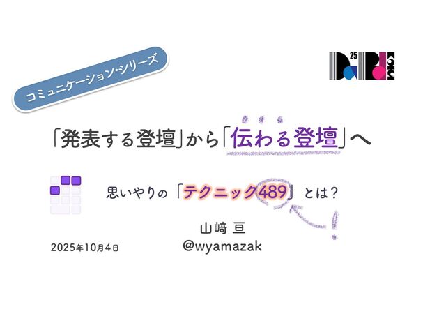 本セッションでは、ほんの少し工夫するだけで、相手の心に届き、理解され、記憶に残り、結果として行動につながる「テクニック489」を紹介します。スピーカーの話し方とスライドの作り方、それぞれに取り入れられる実践的なテクニックを例とともに解説します。