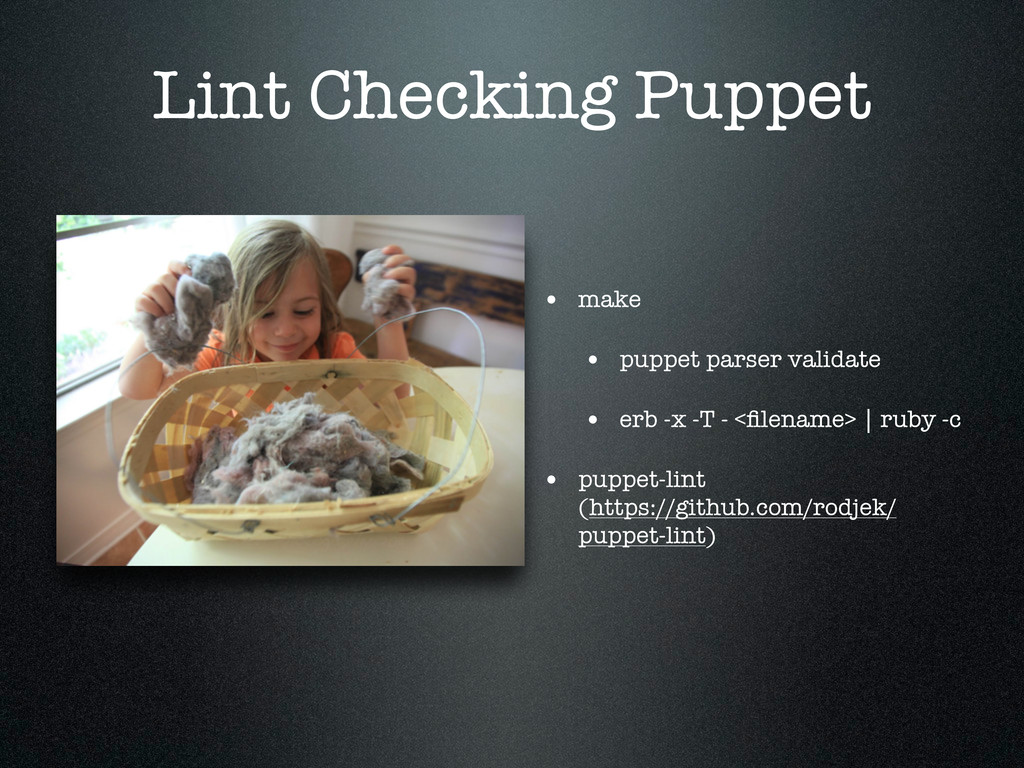 erb -x -T - <filename> | ruby -c • puppet-lint (https://github.com/rodjek/ puppet-lint)